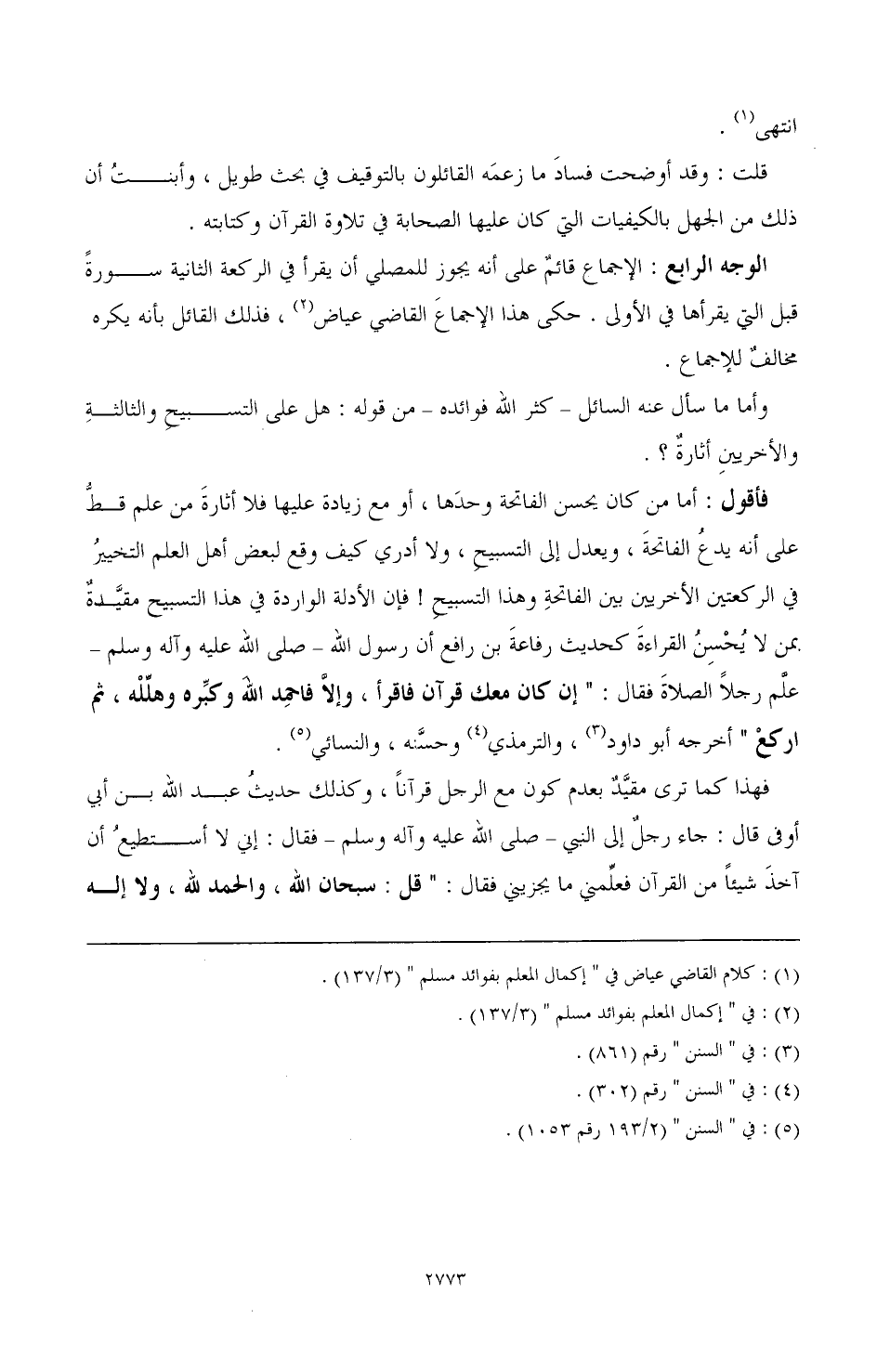 فأقول: أما من كان يحسن الفاتحة وحدها، أو مع زيادة عليها فلا أثارة من علم قط على أنه يدع الفاتحة، ويعدل التسبيح، ولا أدري كيف وقع لبعض أهل العلم التخيير في الركعتين الأخريين بين الفاتحة وهذا التسبيح! فإن الأدالة الواردة في هذا التسبيح مقيدة بمن لا يحسن القراءة كحديث رفاعة بن رافع أن رسول الله - صَلَّى اللهُ عَلَيْهِ وَآلِهِ وَسَلَّمَ - علم رجل الصلاة فقال: "إن كان معك قرآن فاقرأ، وإلا فاحمد الله وكبره وهلله، ثم اركع" أخرجه أبو داود (¬3)، والترمذي (¬4) وحسنه، والنسائي (¬5).