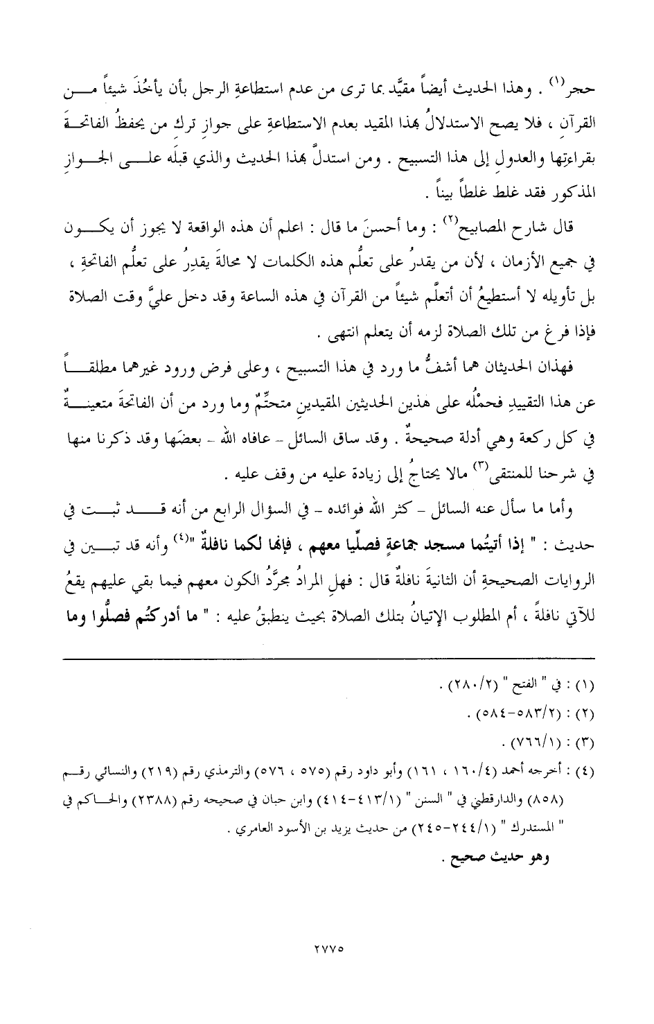 حجر (¬1). وهذا الحديث أيضًا مقيد بما ترى من عدم استطاعة الرجل بأن يأخذ شيئا من القرآن، فلا يصح الاستدلال بهذا المقيد بعدم الاستطاعة على جواز ترك من يحفظ الفاتحة بقراءتها والعدول إلى هذا التسبيح. ومن استدل بهذا الحديث والذي قبله على الجواز المذكور فقد غلط غلطا بينا.
