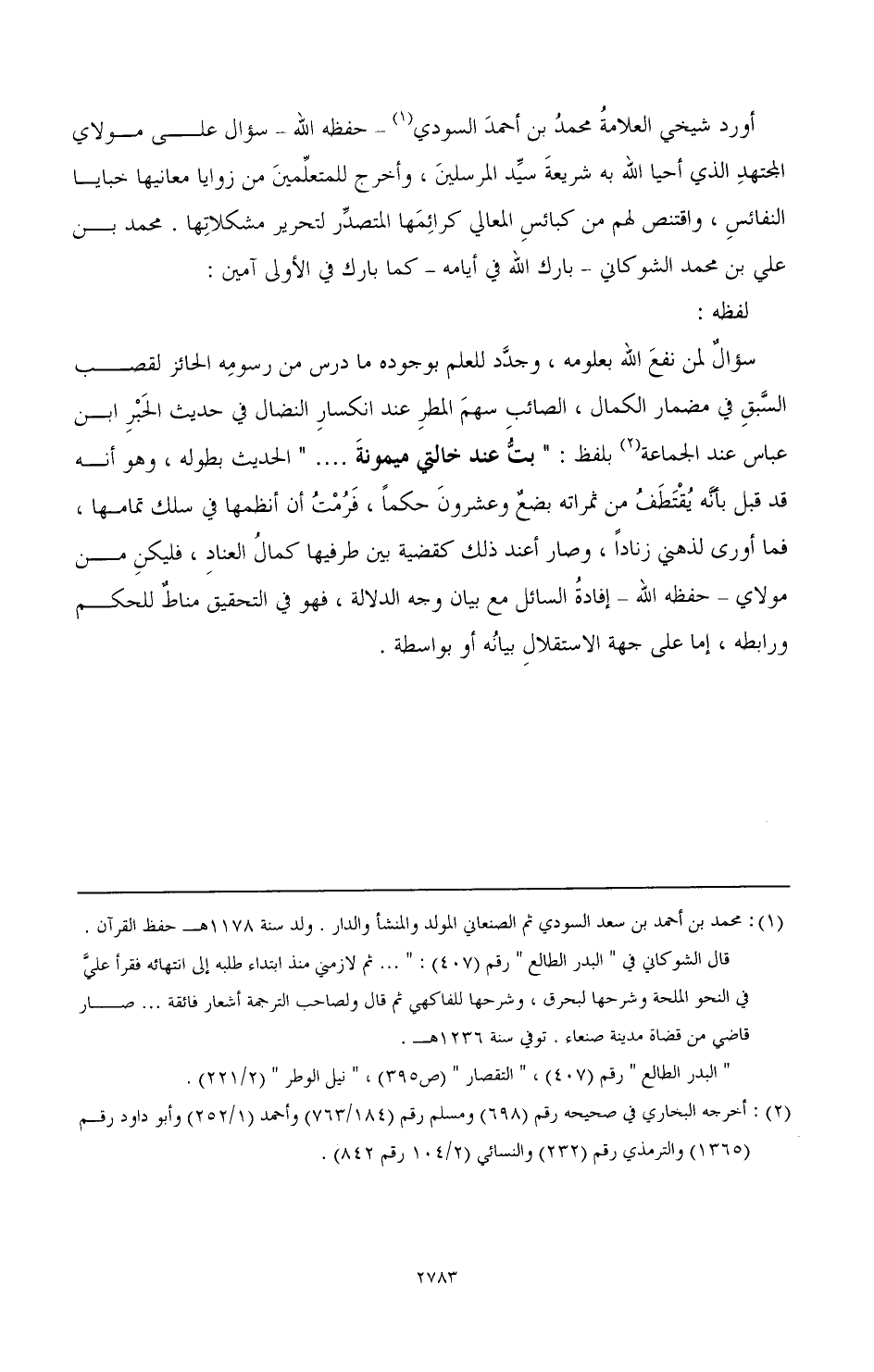 أورد الشيخي العلامة محمد بن أحمد السودي (¬1) - حفظه الله - سؤال على مولاي المجتهد الذي أحيا الله به شريعة سيد المرسلين، وأخرج للمتعلمين من زوايا معانيها خبايا النفائس، واقتنص لهم من كبائس المعالي كرائمها المتصدر لتحرير مشكلاتها. محمد بن علي محمد الشوكاني - بارك الله في أيامه - كما بارك في الأولى آمين: