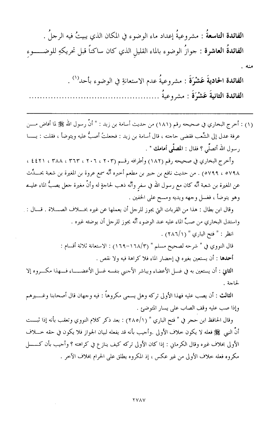 الفائدة الحادية عشرة: مشروعية عدم الاستعانه في الوضوء بأحد (¬1).