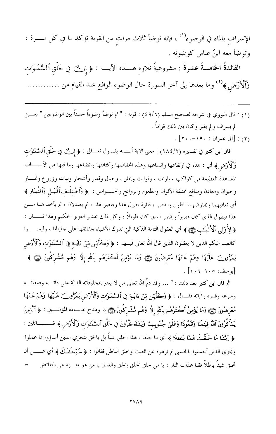 الفائدة الخامسة عشرة: مشروعية تلاوت هذا الآيه: (إِنَّ فِي خَلْقِ السَّمَاوَاتِ وَالْأَرْضِ) (¬2) وما بعدها إلى آخر السورة حال الوضوء الواقع عند القيام من ....................................