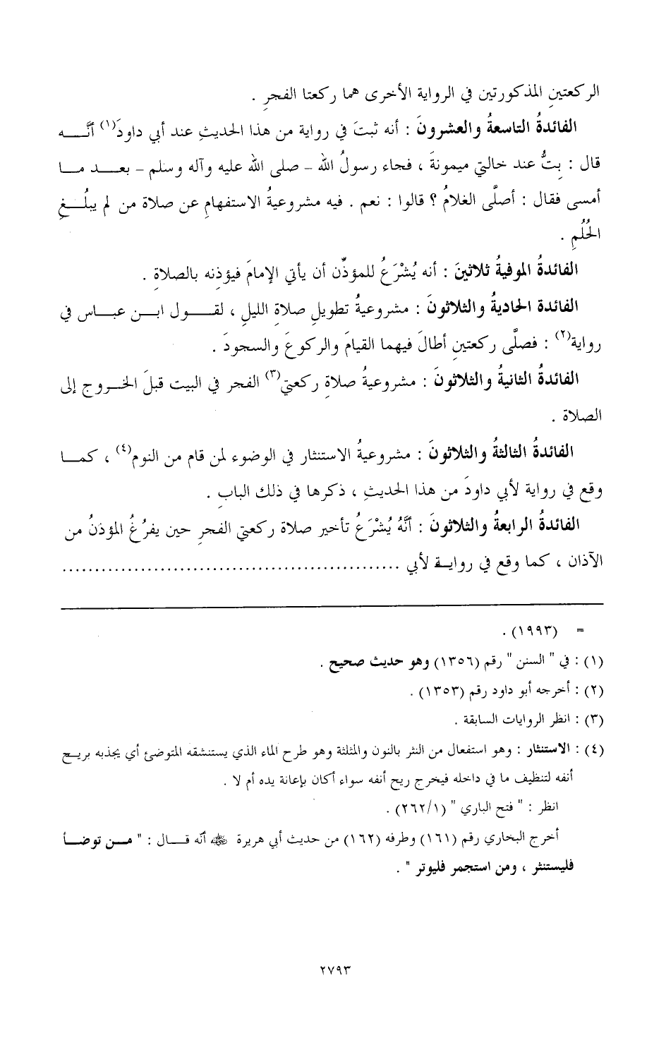 الفائدة الثلاثة والثلاثون: مشروعية الاستنثارفي الوضوء لمن قام من النوم (¬4)، كما وقع في رواية لأبي داود من هذا الحديث، ذكرها في ذلك الباب.