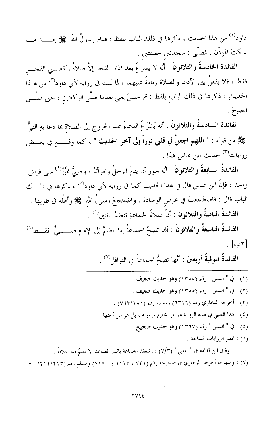 داود (¬1) من هذا الحديث، ذكرها في ذلك الباب بلفظ: فقام رسول الله - صَلَّى اللهُ عَلَيْهِ وَسَلَّمَ - بعدما سكت المؤذن، فصلى: سجدتيين خففتين. الفائدة الخامسة والثلاثون: أنه لا يشرع بعد آذان الفجر إلا صلاة ركعتين الفجر فقط، فلا يفعل بين الآذان والصلاة زيادة عليهما، لما ثبت في رواية لأبي داود (¬2) من هذا الحديث، ذكرها في ذلك الباب بلفظ: ثم يجلس يعني بعدما صلى ركعتين، حتى صلى الصبح.