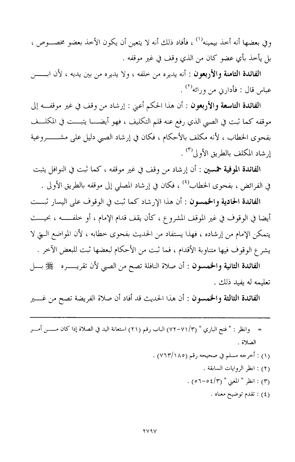 الفائدة التاسعة والأربعون: أن هذا الحكم أعني: إرشاد من وقف في غير موقفه إلى موقفه كما ثبت في الصبي الذي رفع عنه قلم التكليف، فهو أيضًا يثبت في المكلف بفحوى الخطاب، لأنه مكلف با لأحكام، فكان في إرشاد الصبي دليل على مشروعية إرشاد المكلف بالطريق الأولى (¬3).