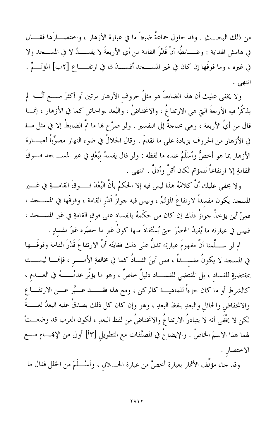 ثم لو سلمنا أن مفهوم عبارته دتل على ذلك فغايته أن الارتفاع قدر القامة وفوقها في المسجد لا يكون مفسدا، فمن أين الفساد كما في مخالفة الأمر، فإنما ليست بمقتضية الفساد، بل المقتضى للفساد دليل خاص، وهو ما يؤثر عدمه في العدم، كالشرط أو ما كان جزءا للماهيه كالركن، ومع هذا فقد عبر عن الارتفاع والانخفاض والحائل والبعد بلفظ البعد، وهو وإن كان كل ذلك يصدق عليه البعد لغة لكن لا يخفى أنه لا يتبادر الارتفاع والانخفاض من لفظ البعد، لكون العرب قد وضعت هذا الاسم الخاص. والإيضاح في المصنفات مع التطويل [3أ] أولى من الأبهام مع الاختصار.