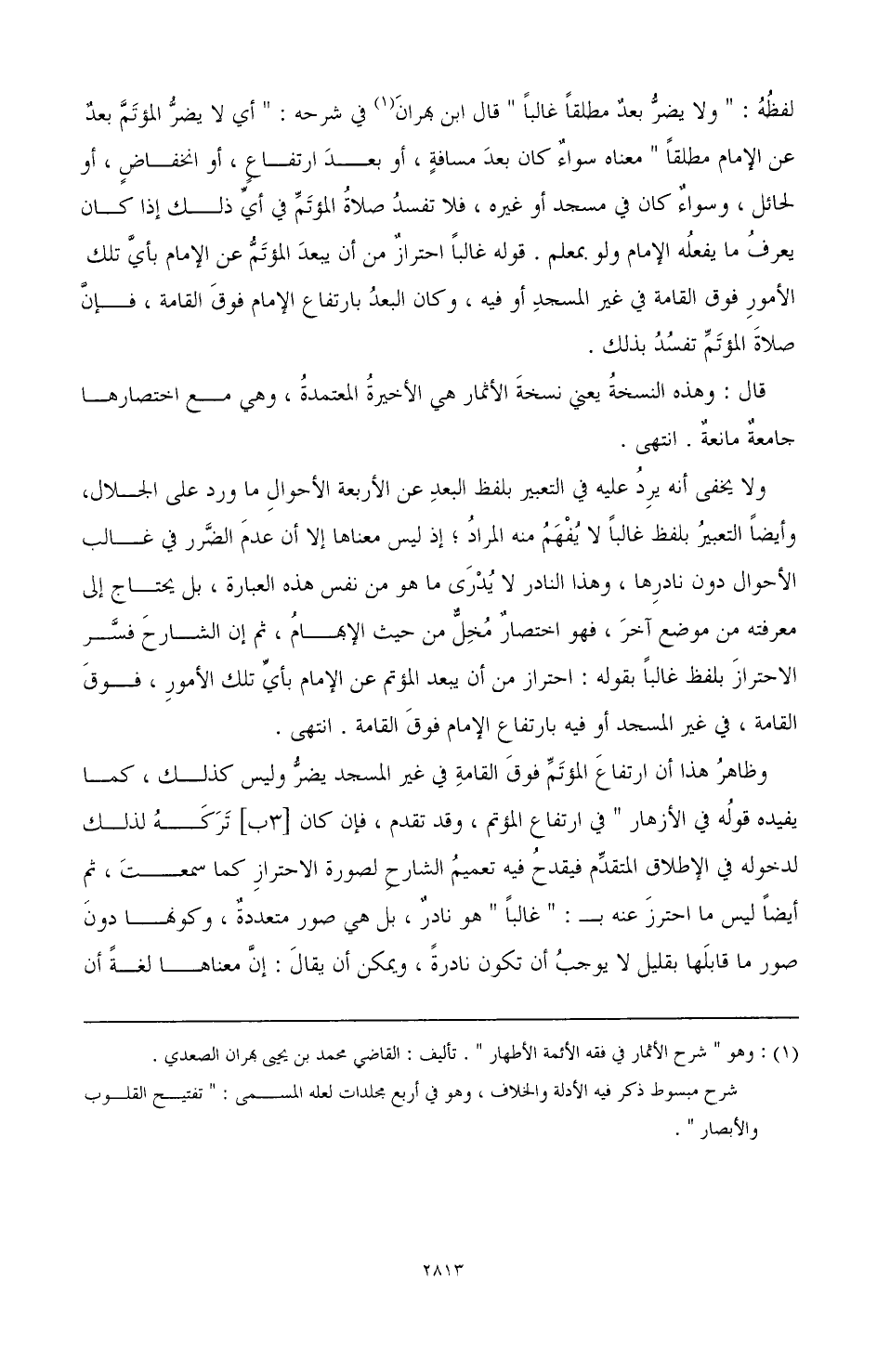 ولا يخفى أنه يرد عليه في التعبير بلفظ البعد عن الأربعة الأحوال ما ورد على الجلال، وأيضا التعبير بلفظ غالبا لا يفهم منه المراد؛ إذ ليس معناها ألا أن عدم الضرر في غالب الأحوال دون نادرها، وهذا النادر لا يدرى ما هو من نفس هذه العبارة، بل يحتاج إلى معرفته من موضع أخر، وهو إختصار مخل من حيث الأبهام، ثم إن الشارح فسر الاحتراز بلفظ غالبا بقوله: احتراز من أن يبعد المؤتم عن الإمام بأي تلك الأمور فوق القامة، في غير المسجد أو فيه بارتفاع الإمام فوق القامة. انتهى.