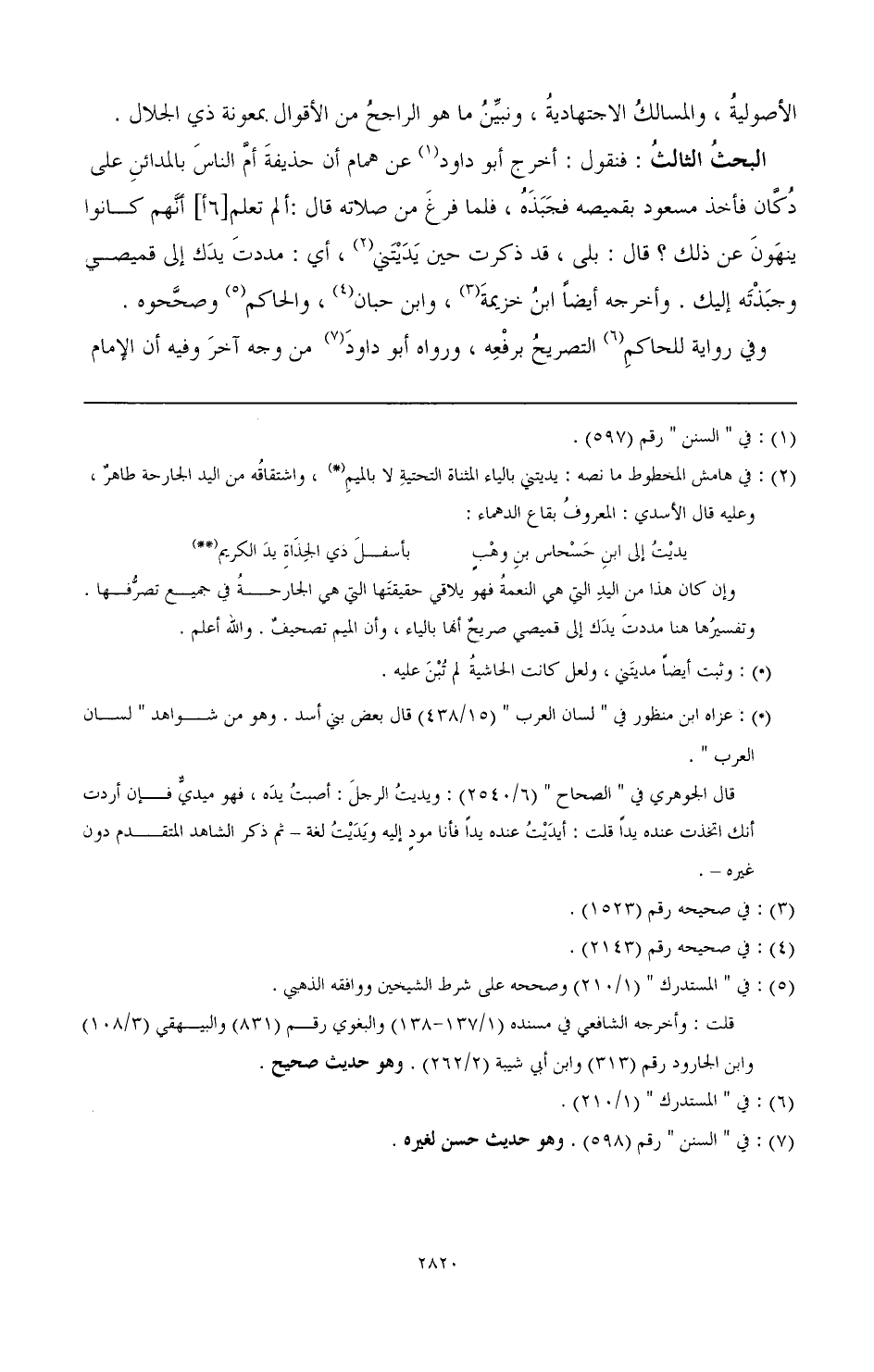 البحث الثالث: فنقول: أخرج أبو داود (¬1) عن همام أن حزيفة أم الناس بالمدائن على دكان فأخذ مسعود بقميصه فجبذه فلما فرغ من صلاته قال: ألم تعلم [6أ] أنهم كانوا ينهون عن ذلك؟ قال: بلى، قد ذكرت حين يديتني (¬2)، أي: مدت يدك إلي قميصي وجبذته إليك. وأخرجه أيضًا ابن خزيمة (¬3)، وابن حبان (¬4)، والحاكم (¬5) وصححوه.