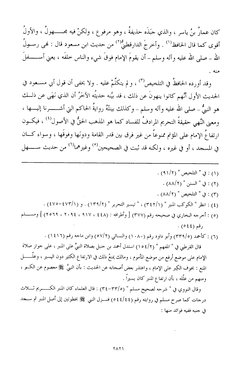 وقد أورده الحافظ في التلخيص (¬3)، ولم يتكلم عليه. ولا يخفى أن قول أبي مسعود في الحديث الأول أنهم كانوا ينهون عن ذلك، وقد بينه حديثه الآخر أن الذي نها عن ذلك هو النبي - صَلَّى اللهُ عَلَيْهِ وَآلِهِ وَسَلَّمَ - وكذلك بينته رواية الحاكم التي أشرنا إليها، ومعنى النهي حقيقة التحريم المرادف للفساد كما هو المذهب الحق في الأصول (¬4)، فيكون ارتفاع الإمام على المؤتم ممنوعا من غير فرق بين قدر القامة ودونها وفوقها، وسواء كان في المسجد، أو في غيره ولكنه قد ثبت في الصحيحين (¬5) وغيرهما (¬6) من حديث سهل