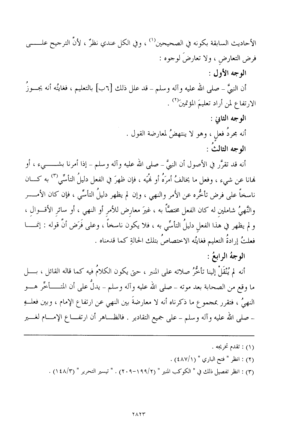 أنه قد تقرر في الأصول أن النبي - صَلَّى اللهُ عَلَيْهِ وَآلِهِ وَسَلَّمَ - إذا أمرنا بشيء، أو نهانا عن شيء، وفعل ما يخالف أمره نهيه، فإن ظهر في الفعل دليل التأسي (¬3) به كان ناسخا على فرض تأخره عن الأمر والنهي، وإن لم يظهر دليل التأسي، فإن كان الأمر والنهي شاملين له كان الفعل مختصا به، غير معارض للأمر أو النهي، أو سائر الأقوال، ولم يظهر في هذا الفعل دليل التأسي به، فلا يكون ناسخا، وعلى فرض أن قوله: إنما فعلت إيرادت التعليم فغايته الاختصاص بتلك الحالة كما قدمناه