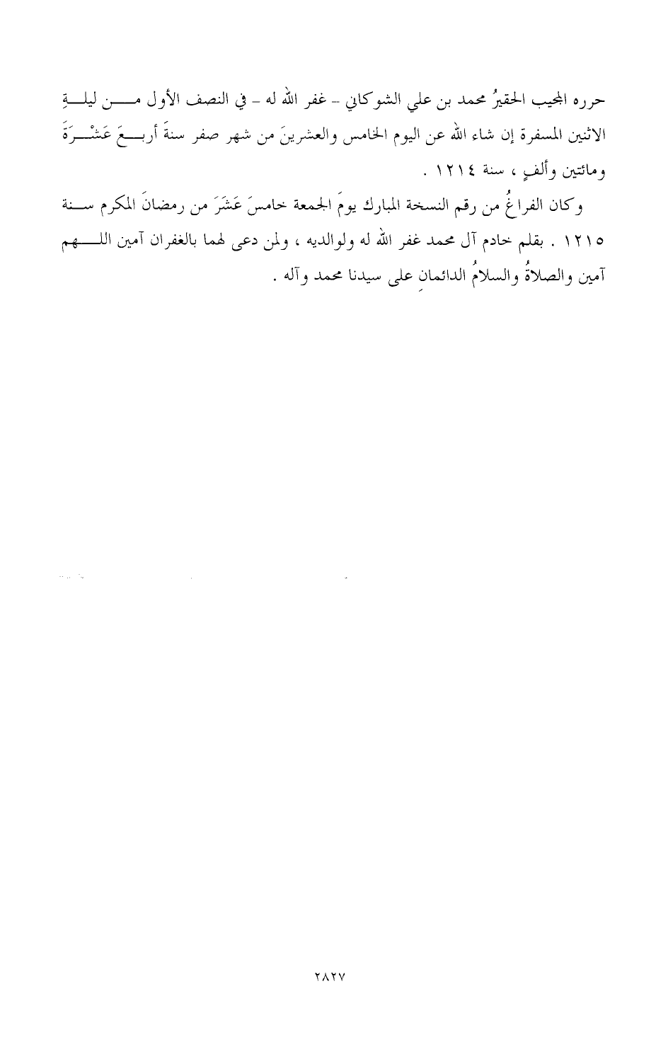حرره المجيب الحقير محمد بن علي الشوكاني - غفر الله له - في النصف الأول من ليلة الاثنين المسفرة إن شاء الله عن اليوم الخامس والعشرين من شهر صفر سنة أربع عشرة ومائتين وألف، سنة 1214.