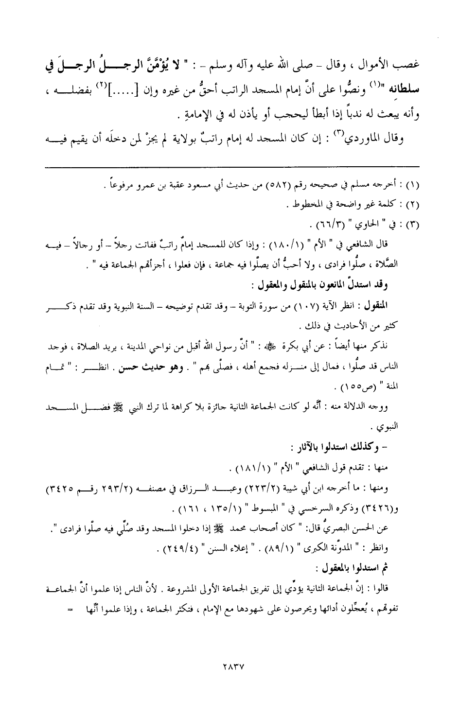 غصب الأموال، وقال -صَلَّى اللهُ عَلَيْهِ وَآلِهِ وَسَلَّمَ -: " لا يأمن الرجل في سلطانه (¬1) ونصوا على أن غمام المسجد الراتب أحق من غيره وإن [ ..... ] (¬2) بفضله، وأنه يبعث له ندبا إذا ابطأ ليحجب أو يأذن له في الإمامة.