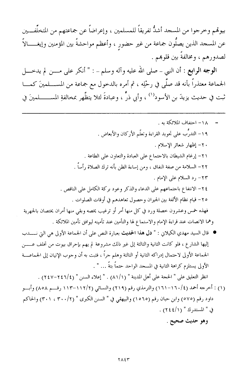 الوجه الرابع: أن النبي - صَلَّى اللهُ عَلَيْهِ وَآلِهِ وَسَلَّمَ -: " أنكر على من لم يدخل الجماعة معتذرا بأنه قد صلى في رحله، ثم أمر بالدخول مع جماعة من المسلمين كما ثبت في الحديث يزيد بن الأسود (¬1)، وأبي ذر، وعبادة لئلا يتظهر بمخالفة المسلمين في