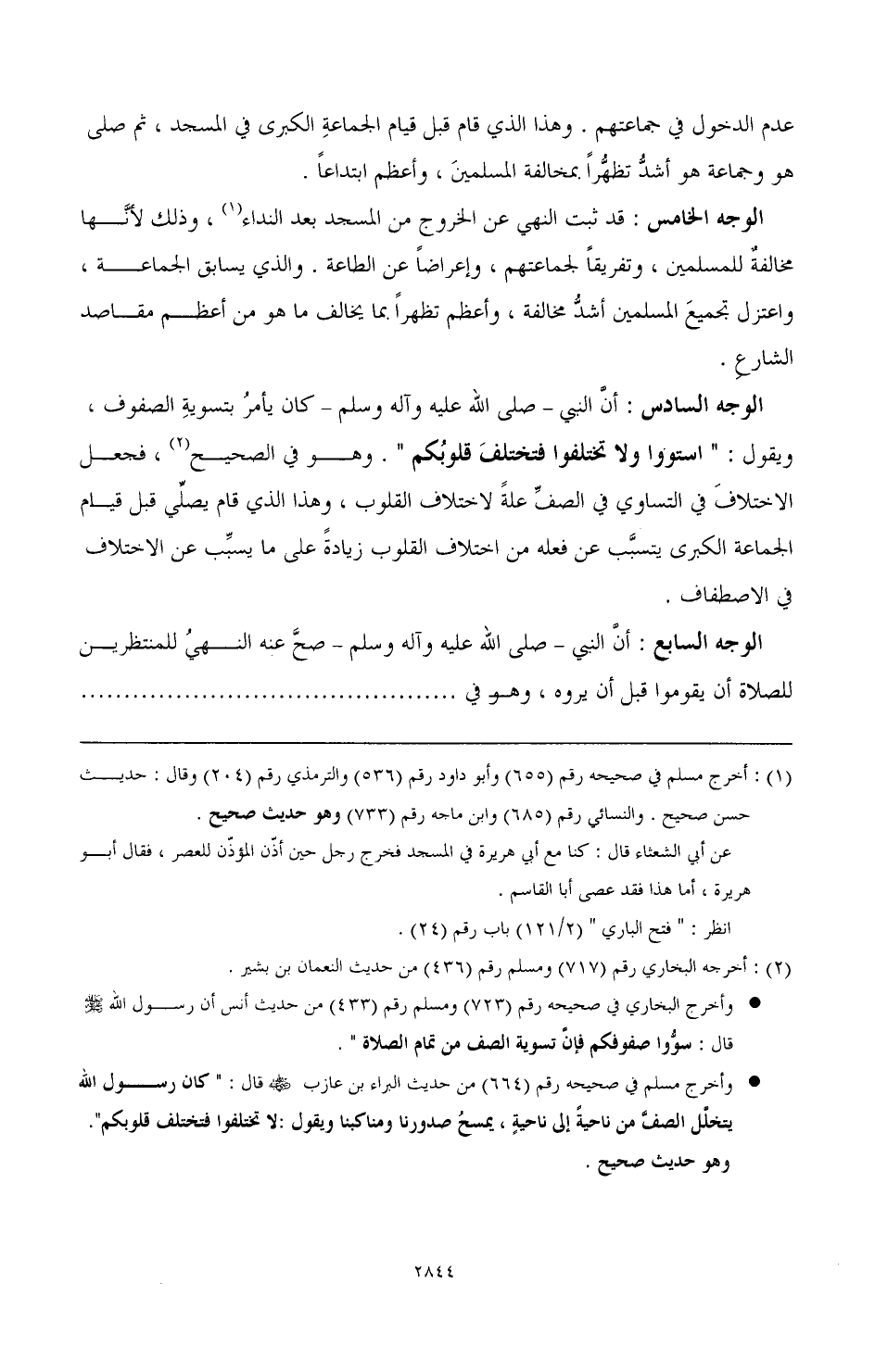 الوجه السادس: أن النبي - صَلَّى اللهُ عَلَيْهِ وَآلِهِ وَسَلَّمَ - كان يأمر بتسوية الصفوف، ويقول: "استووا ولا تختلفوا فتختلف قلبوكم ". وهو في الصحيح (¬2)، فجعل الاختلاف في التساوي في الصف علة لاختلاف القلوب، وهذا الذي قام يصلي قبل قيام جماعة الكبرى يتسبب عن فعله من اختلاف القلوب زيادة على ما يسبب عن الاختلاف في الاصطفاف.