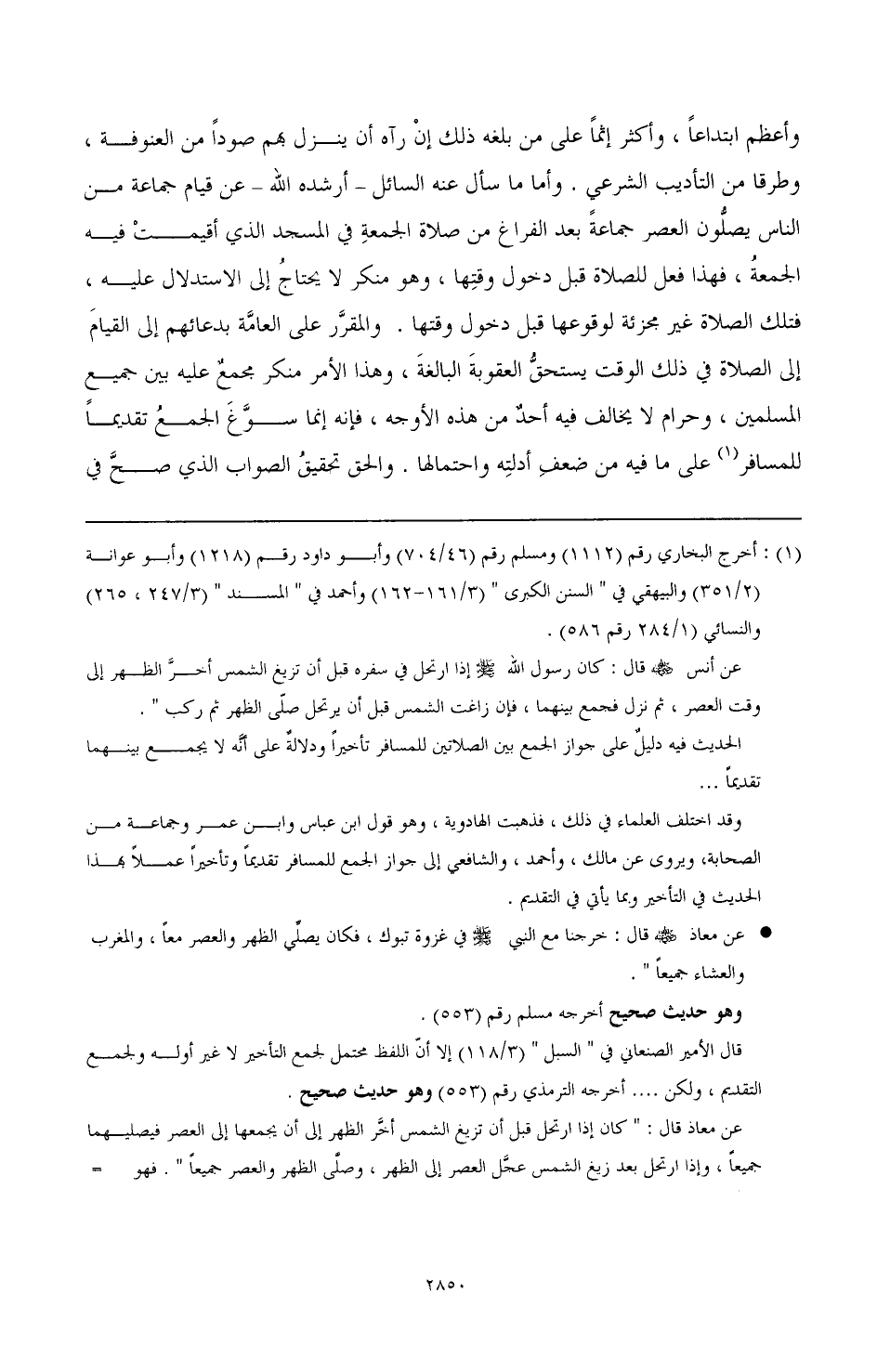 صيغ المسافر بموضع التأخير لا جمع التقديم. وأما المقيم فلم يقل بذلك أحد، ولا أجازه مجيز إلا إذا كان له عذر من مرض أو نحوه، على ما في ذلك من التفاصيل التي لا يتسع المقام لبسطها وأما قيام جماعة على هذه الصفة في جامع من جوامع المسلمين بعد الفراغ من الصلاة الأولى، سواء كانت صفة أو غيرها لغير معذور بين بالأعذار الشرعية فلم يقبل به أحد. وقد جمعنا في هذا رسالة مطولة في أيام قديمة دفعنا بها قول من قال بجواز الجمع مستدلا على ذلك بجمعه - صَلَّى اللهُ عَلَيْهِ وَآلِهِ وَسَلَّمَ - من غير مرض، ولا سفر (¬2). وأوضحنا رواة الحديث فسروه بالحمع الصوري (¬3) لا بهذا الجمع الذي فهمه من لم يرسخ قدمه في علم.