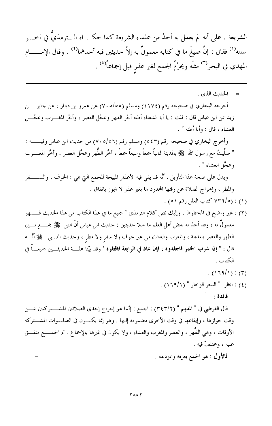 فائدة: قال القرطبي في " المفهم " (2/ 343): الجمع: إنما هو إخراج إحدى الصلاتين المشتركتين عن وقت جوازها، وإيقاعها في وقت الأخرى مضمومة إليها. وهو إنما يكون في الصلوات المشتركة الأوقات، وهي الظهر، والعصر والمغرب والعشاء، ولا يكون في غيرها بالإجماع. ثم الجمع متفق عليه، ومختلف فيه. فالأول: هو الجمع بعرفة والمزدلفة. والمختلف فيه: هو الجمع في السفر والمطر، والمرض. فأما الجمع فإليه ذهب جماعة السلف وفقهاء المحدثين، والشافعي وهو مشهور مذهب مالك، وهل ذلك لمجرد السفر؟ أو لا بد معه من جد السير قولان: بالأول: قال جمهور السلف، وعلماء الحجاز وفقهاء المحدثين، وأهل الظاهر. وبالثاني: قال مالك والليث، والثوري والأوزعي وأبي حنيفة وحده الجمع للمسافر وكرهه الحسن وابن سيرين، وروي عن مالك كراهيته وروى عنه، أنه كرهه للرجال دون النساء وأحاديث ابن عمر، وأنس ومعاذ - تقدم ذكرها - وهي حجة على أبي حنيفة لكن أبو حنيفة تأولها على أن الصلاة الأولى وقعت في آخر وقتها، والثانية وقعت في أول وقتها، وهذا يجوز باتفاق. وقد جاء في حديث معاذ في كتاب أبي داود أنه - صَلَّى اللهُ عَلَيْهِ وَسَلَّمَ - كان إذا ارتحل قبل أن تزيغ الشمس أخر الظهر حتى يجمعها إلى العصر فيصليهما جميعا، وإذا ارتحل بعد زيغ الشمس صلى الظهر والعصر جميعا، ثم سار، وكان إذا ارتحل قبل المغرب أخر المغرب حتى يصليها مع العشاء. وإذا ارتحل بعد المغرب عجل العشاء فصلاها مع المغرب وهذا حجة ظاهرة للجمهور في الرد على أبي حنيفة. وأما الجمع لعذر المطر: فقال به مالك والشافعي، وأحمد، وإسحاق، وجمهور السلف: بين المغرب العشاء، وأما بين الظهر والعصر: فقال بالجمع بينهما في المطر الوابل الشافعي، وأبو ثور، والطبري، وأبو حنيفة، وأصحابه وأهل الظاهر. ولليث، من الجمع في صلاتي الليل والنهار. وأما الجمع لعذر المرض فقال به مالك. إذ خاف الإغماء على عقله، وأبي نافع الجمع لذلك، وقال لا يجمع قبل الوقت، فمن أغمي عليه حتى ذهب وقته لم يجب عليه قضاؤه ومنعه أيضًا أشهب، والشافعي. قال الشوكاني في " السيل الجرار " (1/ 185): " ولقد ابتلي زمننا هذا من بين الأزمنة وديارنا هذه من بين ديار الأرض بقوم جهلوا الشرع، شاركوا في بفض فروع الفقه، فوسعوا دائرة الأوقات، وسوغوا للعامة أن يصلوا في غير أوقات الصلاة، فظنوا أن فعل الصلاة في غير أوقاتها شعبة من شعب التشيع وخصلة من خصال المحبة لأهل البيت فضلوا وأضلوا. وأهل البيت - رحمهم الله براء من هذه المقالة مصونون عن القول بشيء منها ولقد صارت الجماعات الآن تقام في جوامع صنعاء للعصر بعد الفراغ من صلاة الظهر والعشاء في وقت المغرب وصار غالب العوام لا يصلي الظهر والعصر إلا عند اصفرار الشمس، فيا لله وللمسلمين من هذه الفواقر في الدين ". اهـ