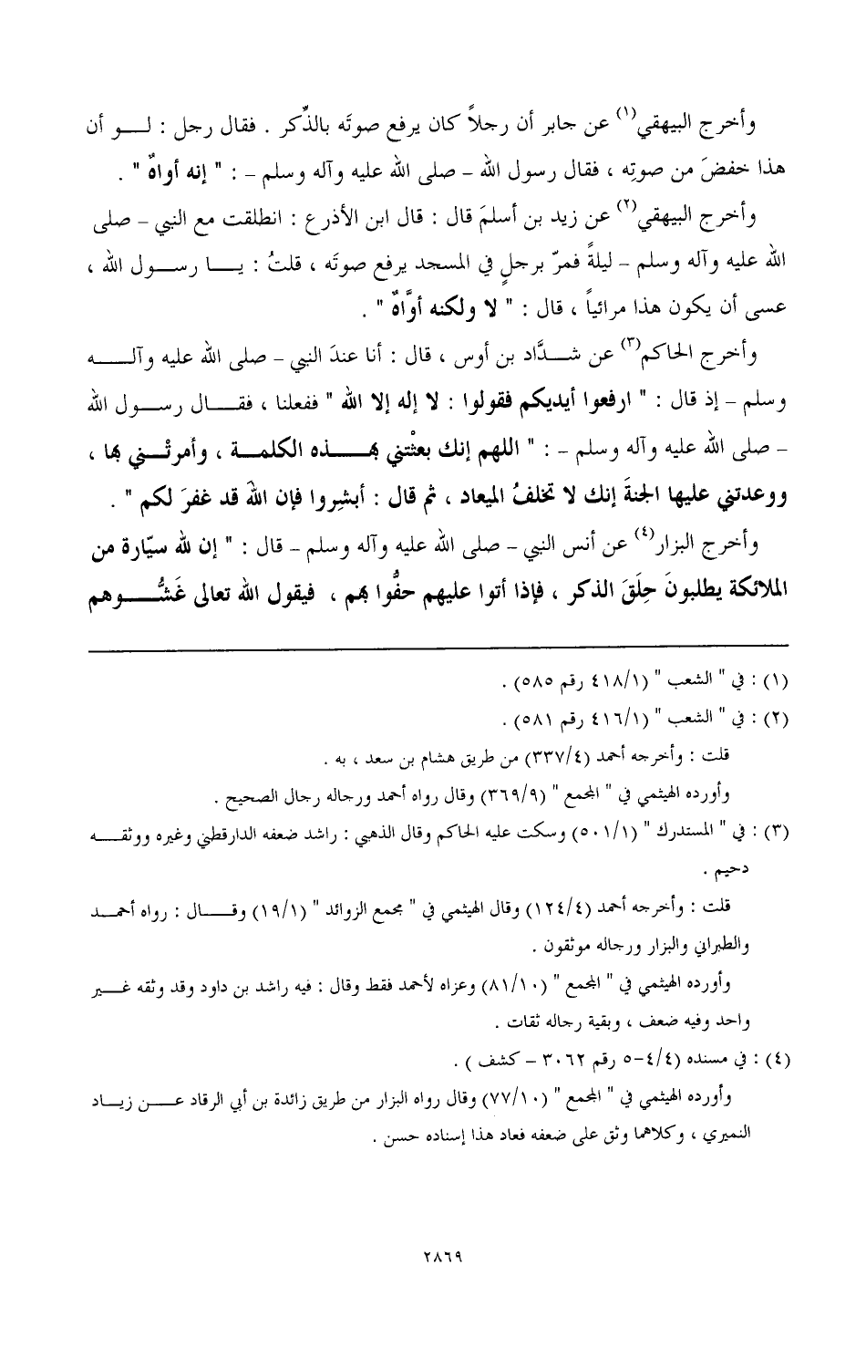وأخرج البيهقي (¬2) عن زيد بن أسلم قال: قال ابن الأذرع: انطلقت مع النبي - صَلَّى اللهُ عَلَيْهِ وَآلِهِ وَسَلَّمَ - ليلة فمر برجل في المسجد يرفع صوته، قلت: يا رسول الله، عسى أن يكون هذا مرائيا، قال: " لا ولكنه أواه ". وأخرج الحاكم (¬3) عن شداد بن أوس. قال: أنا عند النبي - صَلَّى اللهُ عَلَيْهِ وَآلِهِ وَسَلَّمَ - إذ قال: " ارفعوا ايديكم فقولوا: لا إله إلا الله " ففعلنا، فقال رسول الله - صَلَّى اللهُ عَلَيْهِ وَآلِهِ وَسَلَّمَ -: " اللهم إنك بعثتني بهذه الكلمة، وأمرتني بها، ووعدتني عليها الجنة إنك لا تخلف الميعاد، ثم قال: أبشروا فإن الله قد غفر لكم ".