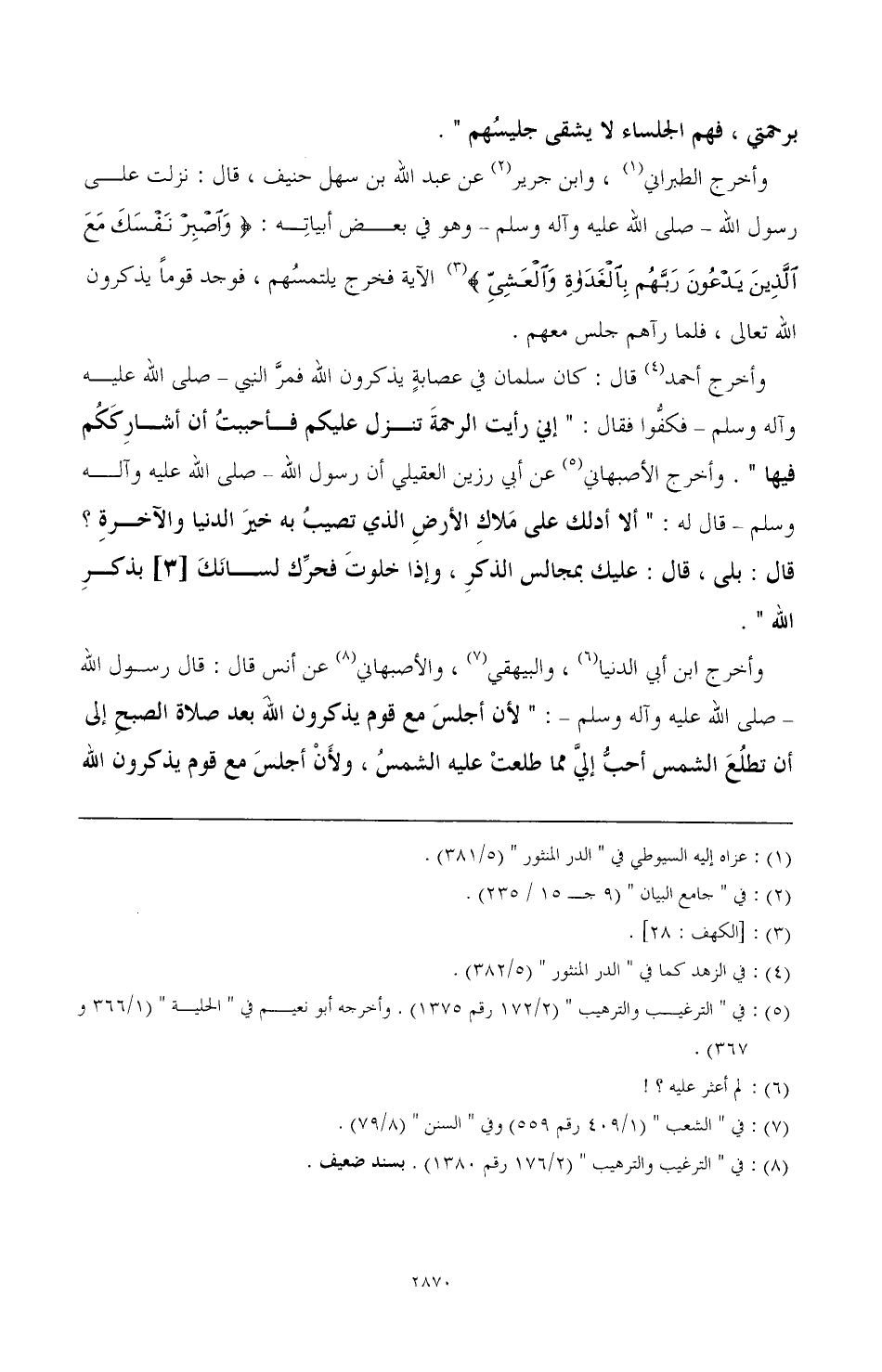 وأخرج أحمد (¬4) قال: كان سلمان في عصابة يذكرون الله فمر النبي - صَلَّى اللهُ عَلَيْهِ وَآلِهِ وَسَلَّمَ - فكفوا فقال: " إني رأيت الرحمة تنزل عليكم فأجببت أن أشارككم فيها ". وأخرج الأصبهاني (¬5) عن أبي رزين العقيلي أن رسول الله - صَلَّى اللهُ عَلَيْهِ وَآلِهِ وَسَلَّمَ - قال له: " ألا أدلك على ملاك الأرض الذي تصيب به خير الدنيا والآخرة؟ قال: بلى، قال: عليك بمجالس الذكر، وإذا خلوت فحرك لسانك [3] بذكر الله ".