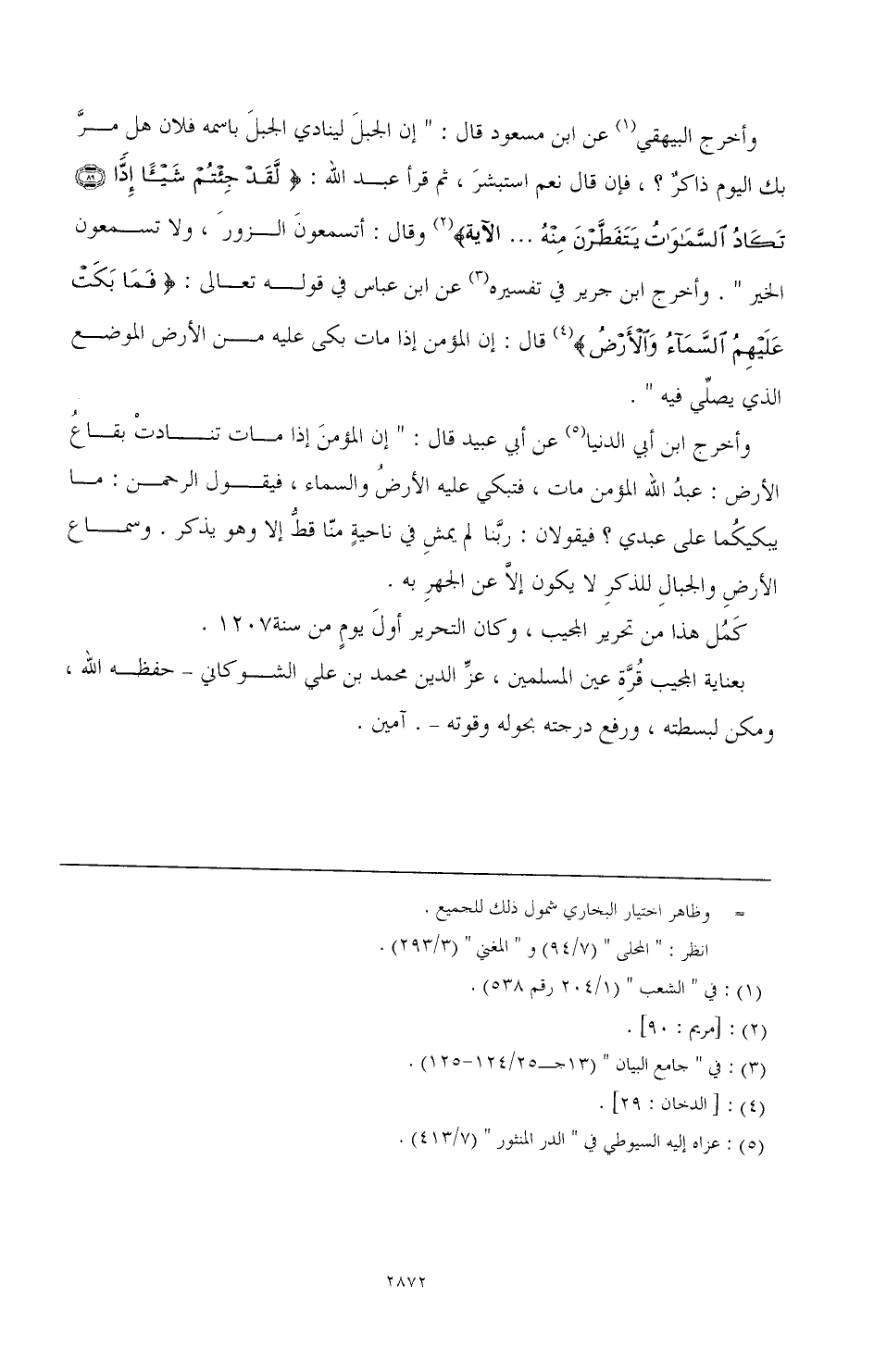 وأخرج البيهقي (¬1) عن ابن مسعود قال: " إن الجبل لينادي الجبل باسمه فلان هل مر بك اليوم ذاكر؟، فإن قال نعم أستبشر، قم قرأ عبد الله: (لَقَدْ جِئْتُمْ شَيْئًا إِدًّا تَكَادُ السَّمَاوَاتُ يَتَفَطَّرْنَ. .. الآية) (¬2) وقال: أتسمعون الزور، ولا تسمعون الخير ". وأخرج ابن جرير في تفسيره (¬3) عن ابن عباس في قوله تعالى: (فَمَا بَكَتْ عَلَيْهِمُ السَّمَاءُ وَالْأَرْضُ) (¬4) قال: إن المؤمن إذا مات بكى عليه من الأرض الموضع الذي يصلي فيه ". واخرج ابن أبي الدنيا (¬5) عن أبي عبيد قال: " إن المؤمن إذا مات تنادت بقاع الأرض: عبد الله المؤمن مات، فتبكي عليه الأرض والسماء، فيقول الرحمن: ما يبكيكما على عبدي؟ فيقولان: ربنا لم يمش في ناحية منا قط إلا وهو يذكر. وسماع الأرض والجبال للذكر لا يكون إلا عن الجهر به.
