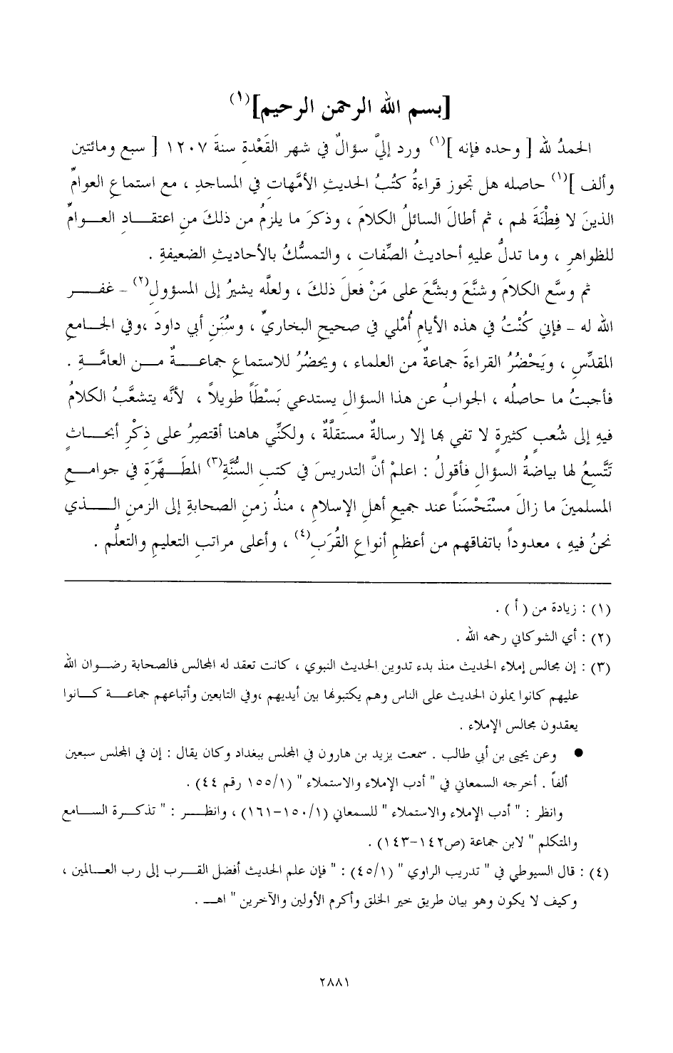 الحمد لله [وحده فإنه] (¬2) ورد إلي سؤال في شهر القعدة سنة 1207 [سبع ومائتين وألف] (¬3) حاصله هل تجوز قراءة كتب الحديث الأمهات في المساجد، مع استماع العوام الذين لا فطنة لهم، ثم أطال السائل الكلام، وذكر ما يلزم من ذلك من اعتقاد العوام للظواهر، وما تدل عليه أحاديث الصفات، والتمسك بالأحاديث الضعيفة.