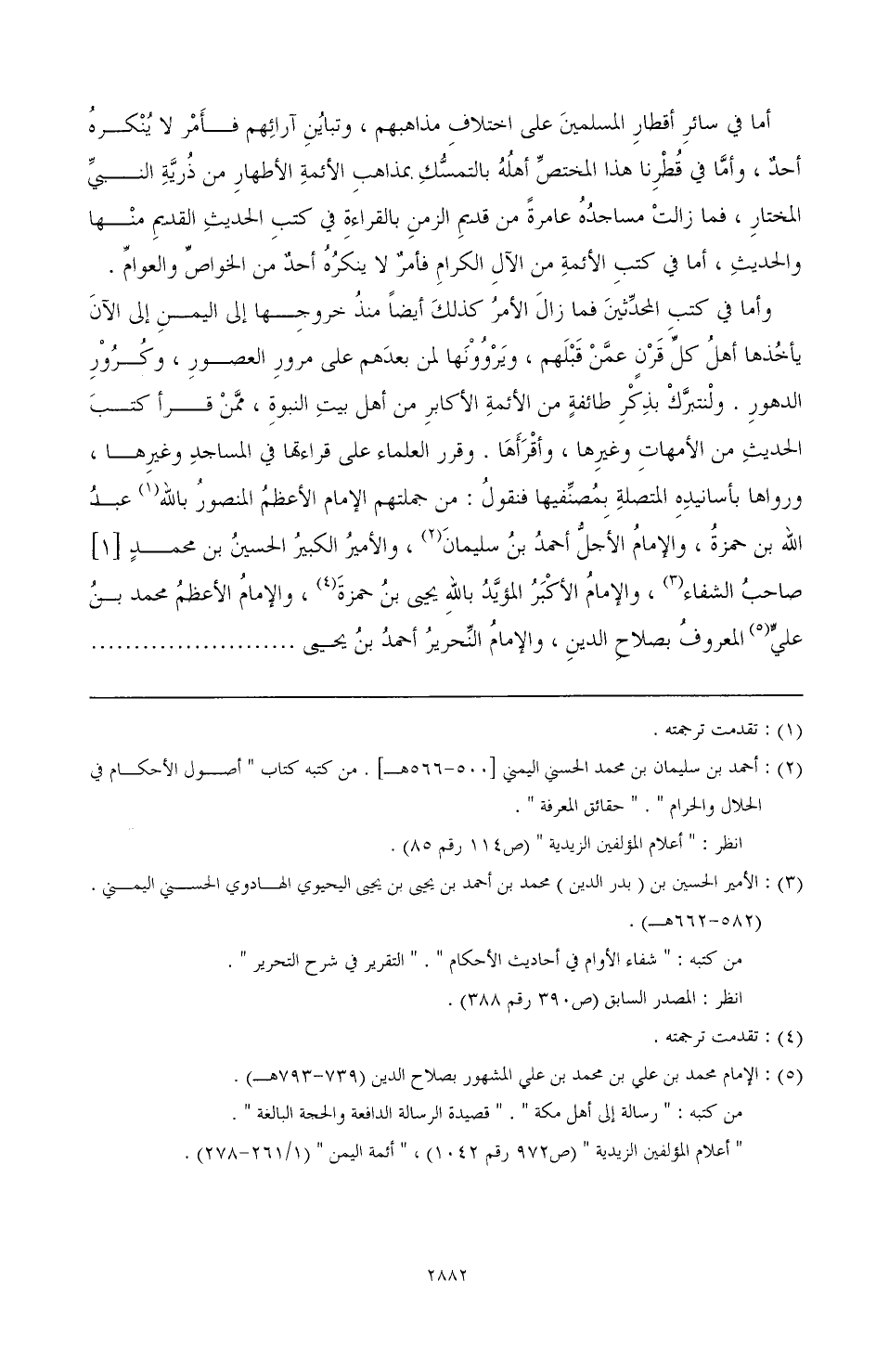 وأما في كتب المحديثين فما زال الأمر كذلك أيضًا منذ خروجها إلى اليمن إلى الآن يأخذها أهل كل قرن عمن قبلهم، ويروونها لمن بعدهم على مرور العصور، كرور الدهور. ولنتبرك بذكر طائفة من الأئمة الأكابر من أهل بيت النبوة، ممن قرأ كتب الحديث من الأهات وغيرها، وأقرأها. وقرر العلماء على قراءتها في المساجد وغيرها، ورواها بأسانيده المتصلة بمصنفيها فنقول: من جملتهم الإمام الأعظم المنصرو بالله (¬1) عبد الله بن حمزة، والإمام الأجل أحمد بن سليمان (¬2)، والأمير الكبير الحسين بن محمد [1] صاحب الشفاء (¬3)، والإمام الأكبر المؤيد بالله يحيى بن حمزة (¬4)، والإمام الأعظم محمد بن علي (¬5) المعروف بصلاح الدين، والإمام النحرير أحمج بن يحيى. ................................