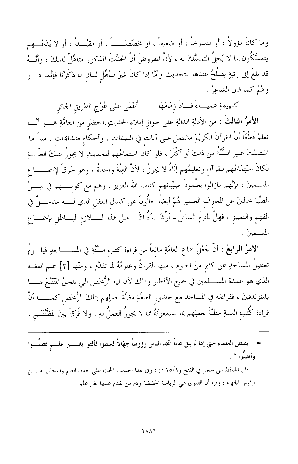والأمر الرابع: أن جعل سماع العامة مانعا من قراءة كتب السنة في المساجد فيلزم تعطيل المساجد عن كثير من العلوم، منها القرآن وعلومه لما تقدم، ومنها [2] علم الفقه الذي هو عمدة المسلمين في جميع الأقطار وذلك لأن فيه الرخص التي تلحق المتتبع لها بالمتزندقين، فقراءته في المساجد مع حضور العامة مظنة لعملهم بتلك الرخص كما أن قراءة كتب السنة مظنة لعملهم بما يسمعونه مما لا يجوز العمل به. ولا فرق بين المظنتين،
