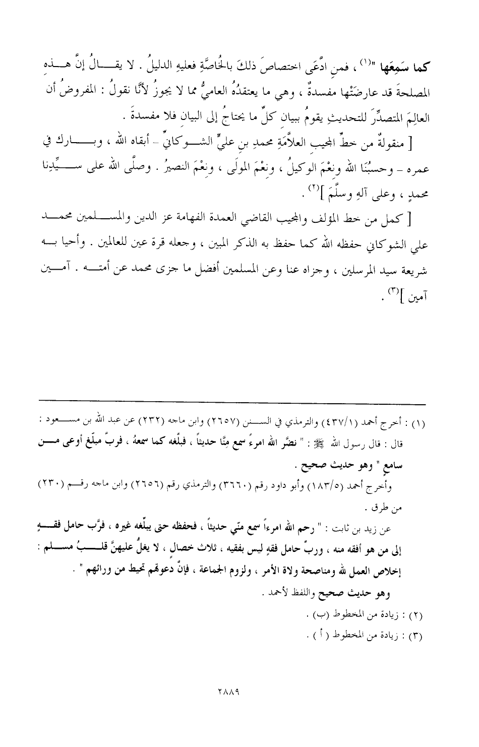 (¬1) أخرج أحمد (1/ 437) والترمذي في السنن (2657) وابن ماجه (232) عن عبد الله بن مسعود: قال: قال رسول الله - صَلَّى اللهُ عَلَيْهِ وَسَلَّمَ -: " نضر الله أمرء سمع منا حديثا، فبلغه كما سمعه، فرب مبلغ أوعى من سامع " وهو حديث صحيح.