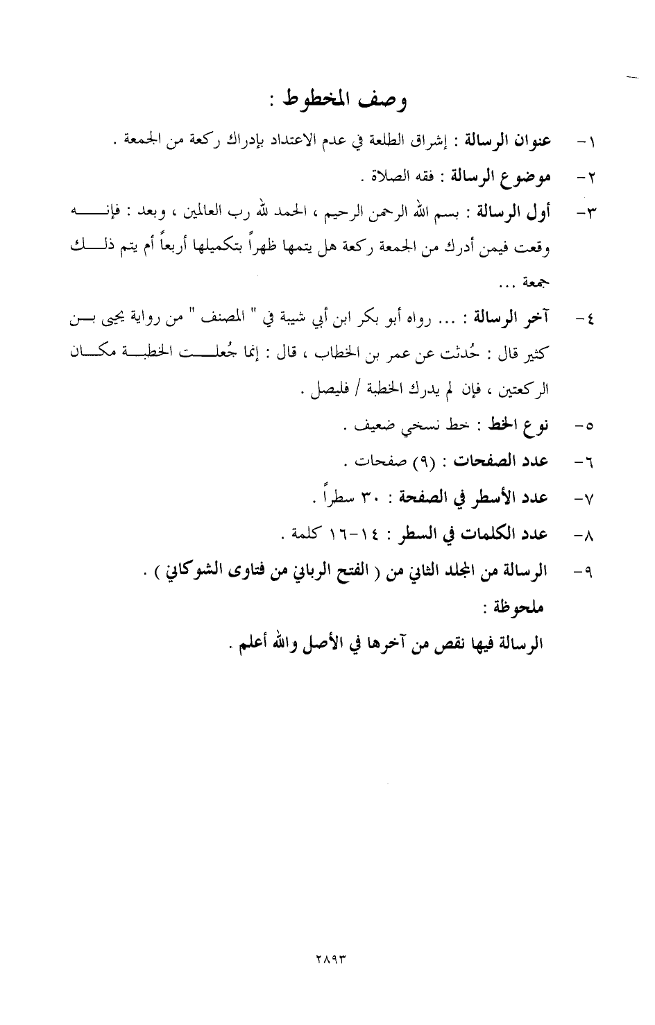 3 - أول الرسالة: بسم الله الرحمن الرحيم، الحمد لله رب العالمين، وبعد: فإنه وقعت فيمن أدرك من الجمعة ركعة هل يتمها ظهرا بتكميلها أربعا أم يتم ذلك جمعة. ..