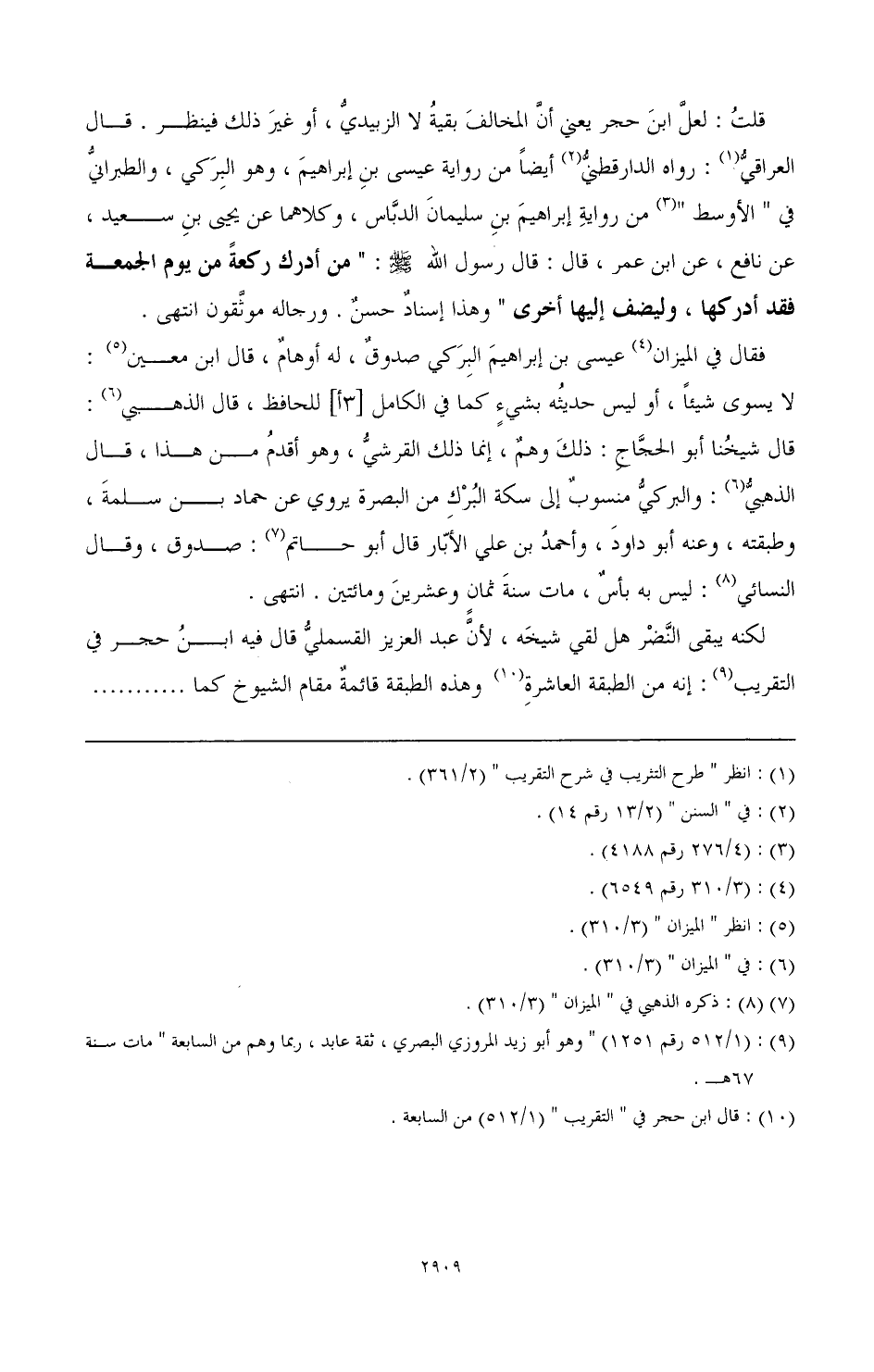 قلت: لعل ابن حجر يعني أن المخالف بقية لا الزبيدي، أو غير ذلك فينظر. قال العراقي (¬1): وراه الدارقطني (¬2) أيضًا من رواية عيسى بن إبراهيم، وهو البركي، والطبراني في " الأوسط " (¬3) من رواية إبراهيم بن سليمان الدباس، وكلاهما عن يحيى بن سعيد، عن نافع، عن ابن عمر، قال: قال رسول الله - صَلَّى اللهُ عَلَيْهِ وَسَلَّمَ -: " من أدرك ركعة من يوم الجمعة فقد أدركها، وليضف إليها أخرى " وهذا إسناد حسن. ورجاله موثقون انتهى.