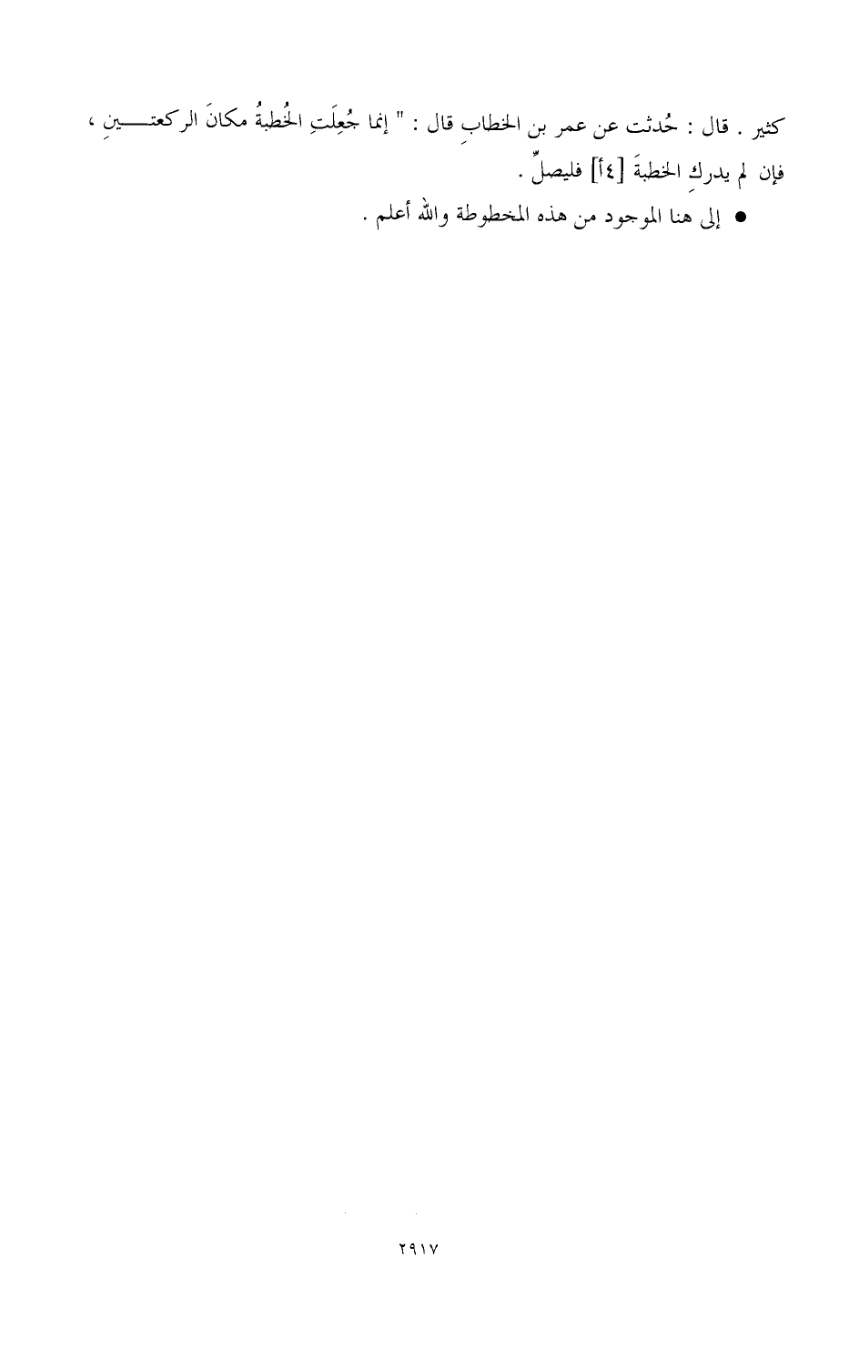 كثير. قال: حدثت عن عمر بن الخطاب قال: " إنما جعلت الخطبة مكان الركعتين، فإن لم يدرك الخطبة [4 أ] فليصل.