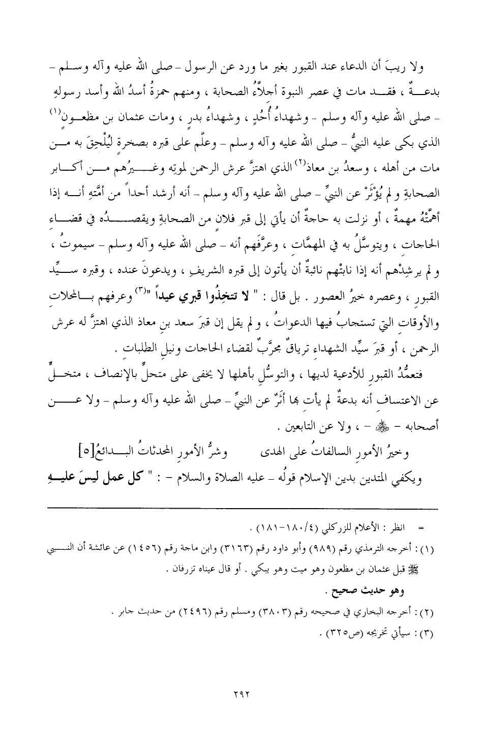 ولا ريب أن الدعاء عند القبور بغير ما ورد عن الرسول- صَلَّى اللهُ عَلَيْهِ وَآلِهِ وَسَلَّمَ- بدعة، فقد مات في عصر النبوة أجلاء الصحابة، ومنهم حمزة أسد الله وأسد رسوله - صَلَّى اللهُ عَلَيْهِ وَآلِهِ وَسَلَّمَ- وشهداء أحد، وشهداء بدر، ومات عثمان بن مظعون (¬1) الذي بكى عليه النبي- صَلَّى اللهُ عَلَيْهِ وَآلِهِ وَسَلَّمَ- وعلم على قبره بصخرة ليلحق به من مات من أهله. وسعد بن معاذ (¬2) الذي اهتز عرش الرحمن لموته، وغيرهم من أكابر الصحابة ولم يؤثر عن النبي- صَلَّى اللهُ عَلَيْهِ وَآلِهِ وَسَلَّمَ- أنه أرشد أحدا من أمته أنه إذا أهمته مهمة، أو نزلت به حاجة أن يأتي إلى قبر فلان من الصحابة ويقصده في قضاء الحاجات، ويتوسل به في المهمات. وعرفهم أنه- صَلَّى اللهُ عَلَيْهِ وَآلِهِ وَسَلَّمَ- سيموت، ولم يرشدهم أنه إذا نابتهم نائبة أن يأتون إلى قبره الشريف، ويدعون عنده، وقبره سيد القبور، وعصره خير العصور. بل قال: "لا تتخذوا قبري عيدا" (¬3) وعرفهم بالمحلات والأوقات التي تستجاب فيها الدعوات، ولم يقل إن قبر سعد بن معاذ الذي اهتز له عرش الرحمن، أو قبر سيد الشهداء ترياق مجرب لقضاء الحاجات ونيل الطلبات.