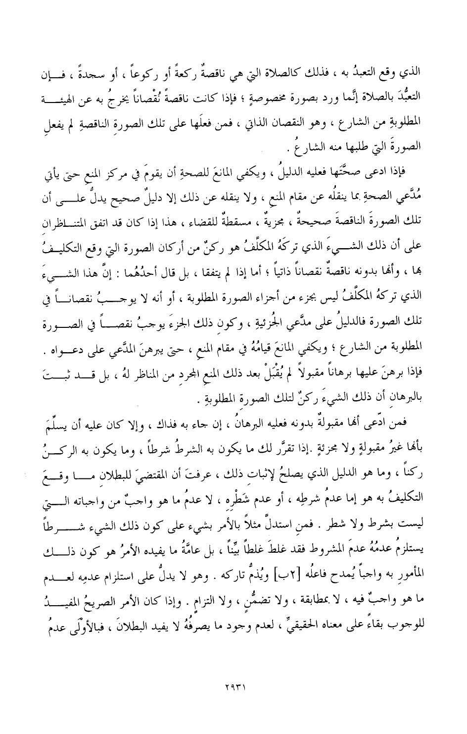 فإذا ادعى صحتها فعليه الدليل، ويكفي المانع للصحة أن يقوم في مركز المنع حتى يأتي مدعي الصحة بما ينقله عن مقام المنع، ولا ينقله عن ذلك إلا دليل صحيح يدل على أن تلك الصورة الناقصة صحيحة، مجزية، مسقطة للقضاء، هذا إذا كان قد اتفق المتناظران على أن ذلك الشيء الذي تركه المكلف هو ركن من أركان الصورة التي وقع التكليف بها، وأنها بدونه ناقصة نقصانا ذاتيا؛ أما إذا لم يتفقا، بل قال أحدهما: إن هذ الشيء الذي تركه المكلف ليس بجزء من أجزاء الصورة المطلوبة، أو أنه لا يوجب نقصانا في تلك الصورة فالدليل على مدعي الجزئية، وكون ذلك الجزء يوجب نقصا في الصورة المطلوبة من الشارع؛ ويكفي المانع قيامه في مقام المنع، حتى يبرهن المدعي على دعواه. فإذا برهن عليها برهانا مقبولا لم يقبل بعد ذلك المنع المجرد من المناظر له، بل قد ثبت بالبرهان أن ذلك الشيء ركن لتلك الصورة المطلوبة.