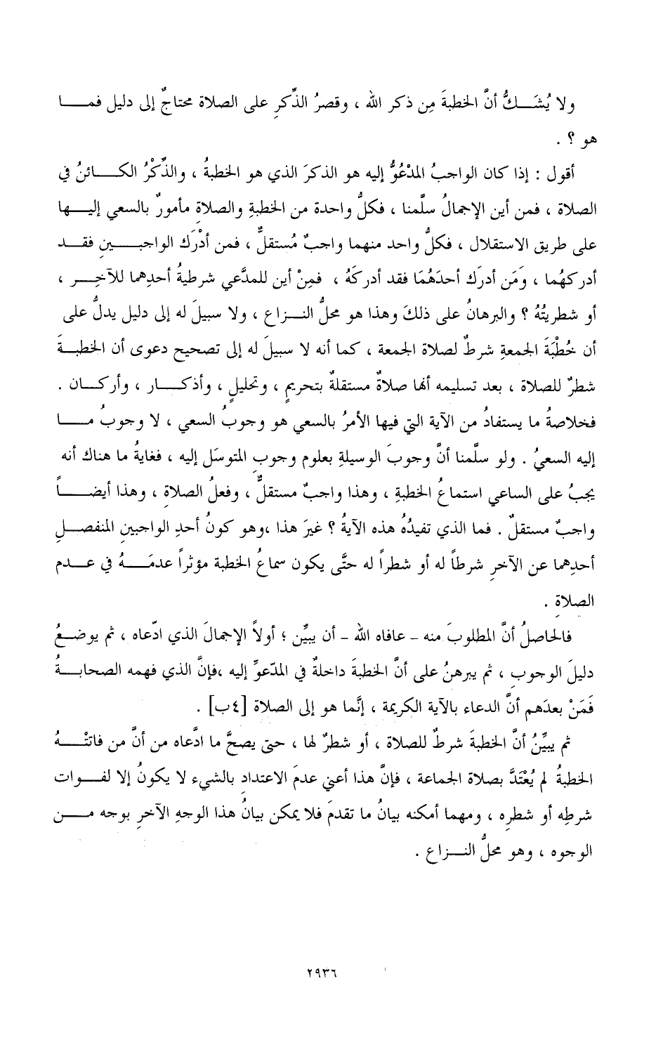 أقول: إذا كان الواجب المدعو إليه هو الذكر الذي هو الخطبة، والذكر الكائن في الصلاة، فمن أين الإجمال سلمنا، فكل واحدة من الخطبة والصلاة مأمور بالسعي إليها على طريق الاستقلال، فكل واحد منهما واجب مستقل، فمن أدرك الواجبين فقد أدركهما، من أدرك أحدهما فقد أدركه، فمن أين للمدعي شرطية أحدهما للآخر، أو شطريته؟ والبرهان على ذلك وهذا هو محل النزاع، ولا سبيل له إلى ذليل يدل على أن خطبة الجمعة شرط لصلاة الجمعة، كما أنه لا سبيل له إلى تصحيح دعوى أن الخطبة شطر للصلاة، بعد تسليمه أنها صلاة مستقلة بتحريم، وتحليل، وأذكار، وأركان. فخلاصة ما يستفاد من الآية التي فيها الأمر بالسعي هو وجوب السعي، لا وجوب ما إليه السعي. ولو سلمنا أن وجوب الوسيلة بعلوم وجوب المتوسل إليه، فغاية ما هناك أنه يجب على الساعي استماع الخطبة، وهذا واجب مستقل، وفعل الصلاة، وهذا أيضًا واجب مستقل. فما الذي تقيده هذه الآية؟ غير هذا، وهو كون أحد الواجبين المنفصل أحدهما عن الآخر شرطا له أو شطرا له حتى يكون سماع الخطبة مؤثرا عدمه في عدم الصلاة.