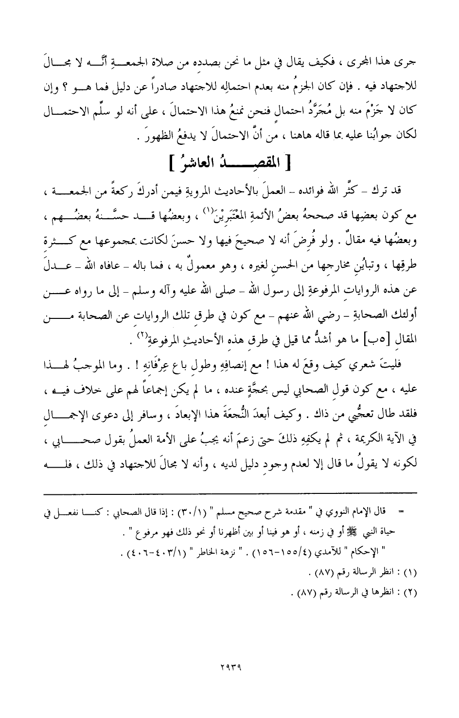 جرى هذا المجرى، فكيف يقال في مثل ما نحن بصدده من صلاة الجمعة أنه لا مجال للاجتهاد فيه. فإن كان الجزم منه بعدم احتماله للاجتهاد صادرا عن دليل فما هو؟ وإن كان لا جزم منه بل مجرد احتمال فنحن نمنع هذا الاحتمال، على أنه لو سلم الاحتمال لكان جوابنا عليه بما قاله هاهنا، من أن الاحتمال لا يدفع الظهور. [المقصد العاشر]
