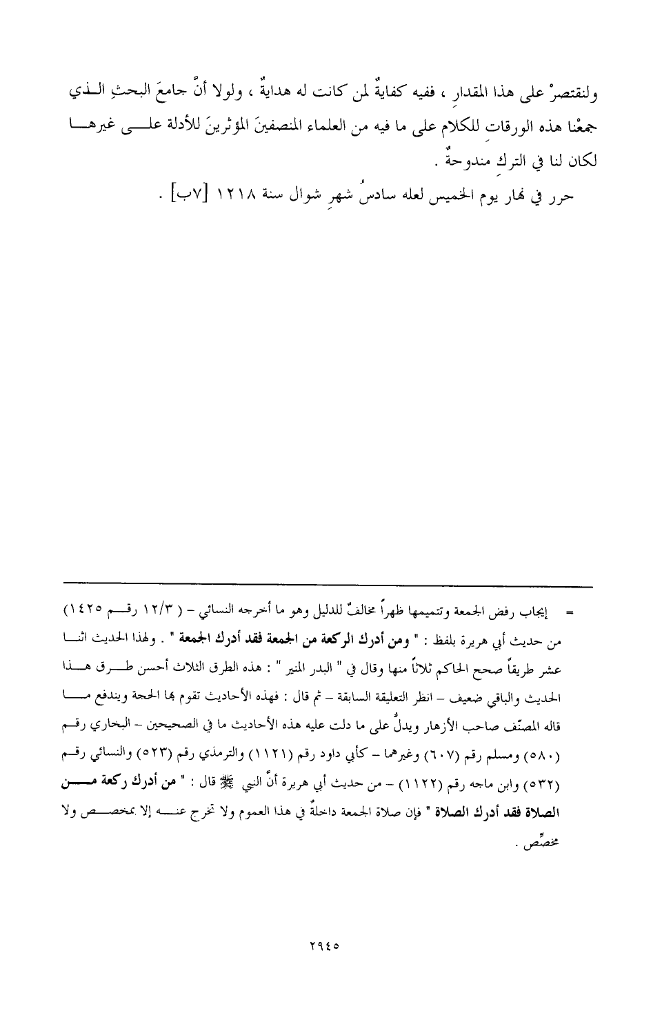 ولنقتصر على هذا المقدار، ففيه كفاية لمن كانت له هداية، ولولا أن جامع البحث الذي جمعنا هذه الورقات للكلام على ما فيه من العلماء المنصفين المؤثرين للأدلة على غيرها كلان لنا في الترك مندوحة.