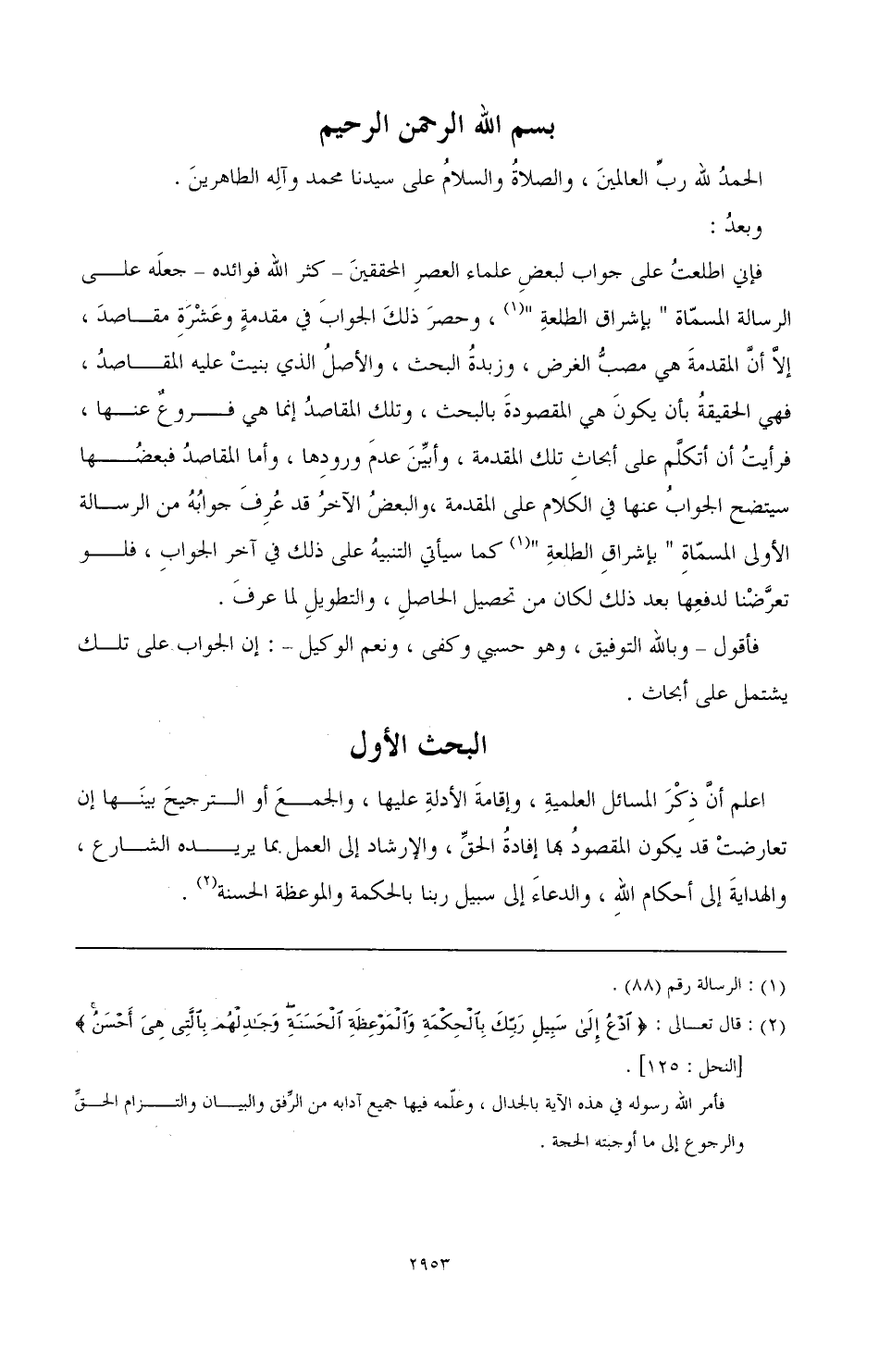 فأقول وبالله التوفيق، وهو حسبي وكفى، ونعم الوكيل: إن الجواب على تلك يشتمل على أبحاث.