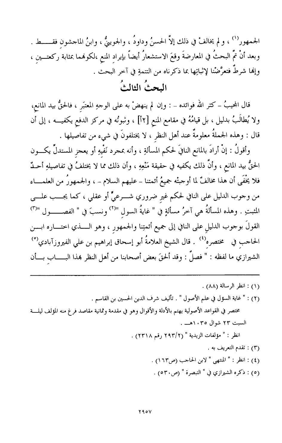 وأقول: إن أراد بالمانع النافي لحكم المسألة، وأنه بمجرد نفيه أو يعجز المستدل يكون الحق بيد المانع، وأن ذلك يكفيه في حقيقة منعه، وأن ذلك مما لا يختلف في تفاصيله أحد، فلا يخفى أن هذا مخالف لما أوجبته جميع أئمتنا عليهم السلام، والجمهور من العلماء من وجوب الدليل على النافي لحكم غير ضروري شرعي أو عقلي، كما يجب على المثبت. وهذه المسألة هي آخر مسألة في» غاية السول " (¬2) ونسب في الفصول (¬3) القول بوجوب الدليل على النافي إلى جميع أئمتنا والجمهور، وهو الذي اختاره ابن الحاجب في مختصره (¬4) قال الشيخ العلامة أبو إسحاق إبراهيم بن علي الفيروزآبادي (¬5) الشيرازي ما لفظه: فصل: وقد ألحق بعض أصحابنا من أهل النظر بهذا الباب بأن