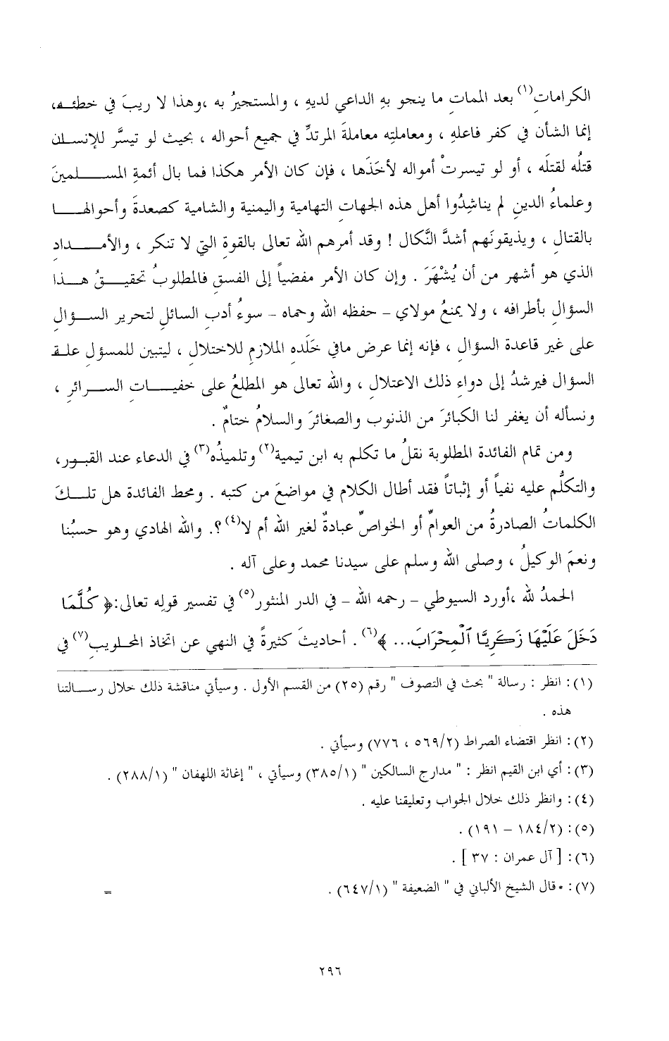 ومن تمام الفائدة المطلوبة نقل ما تكلم به ابن تيمية (¬2) وتلميذه (¬3) في الدعاء عند القبور، والتكلم عليه نفيا أو إثباتا، فقد أطال الكلام في مواضع من كتبه. ومحط الفائدة هل تلك الكلمات الصادرة من العوام أو الخواص عبادة لغير الله أم لا (¬4)؟ والله الهادي وهو حسبنا ونعم الوكيل، وصلى الله وسلم على سيدنا محمد وعلى آله.