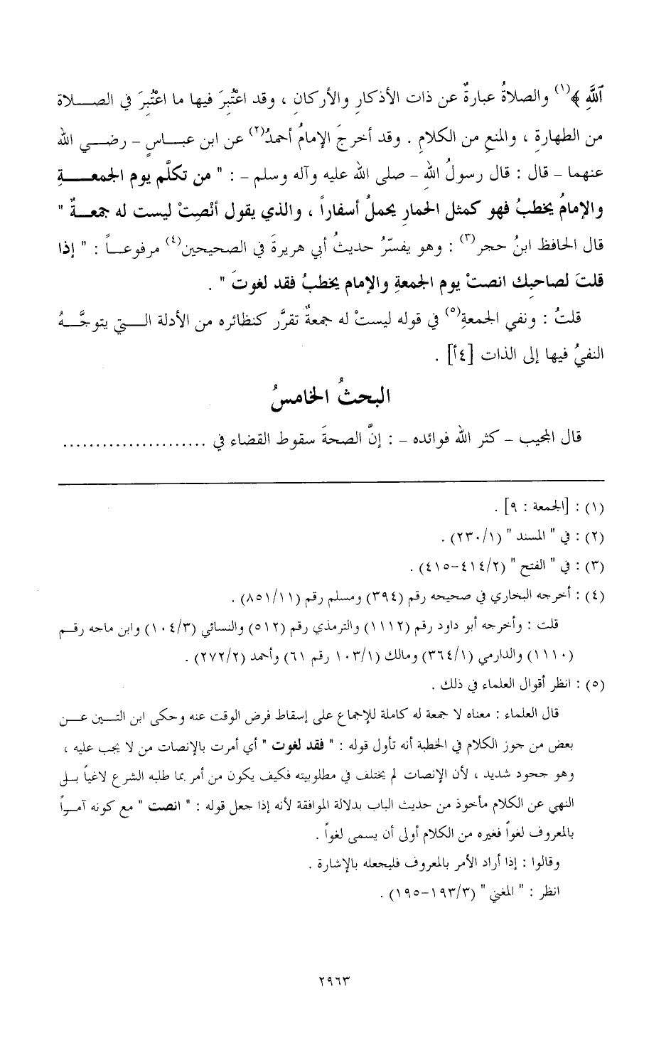 والصلاة عبارة عن ذات الأذكار والأركان، وقد اعتبر فيها ما اعتبر في الصلاة من الطهارة، والمنع من الكلام. وقد أخرج الإمام أحمد (¬1) عن ابن عباس رضي الله عنهما قال: قال رسول الله صَلَّى اللهُ عَلَيْهِ وَآلِهِ وَسَلَّمَ: من تكلم يوم الجمعة والإمام يخطب فهو كمثل الحمار يحمل أسفارا، والذي يقول أنصت ليست له جمعة. قال الحافظ ابن حجر (¬2) وهو يفسر حديث أبي هريرة في الصحيحين (¬3) مرفوعا: إذا قلت لصاحبك: أنصت يوم الجمعة والإمام يخطب فقد لغوت.