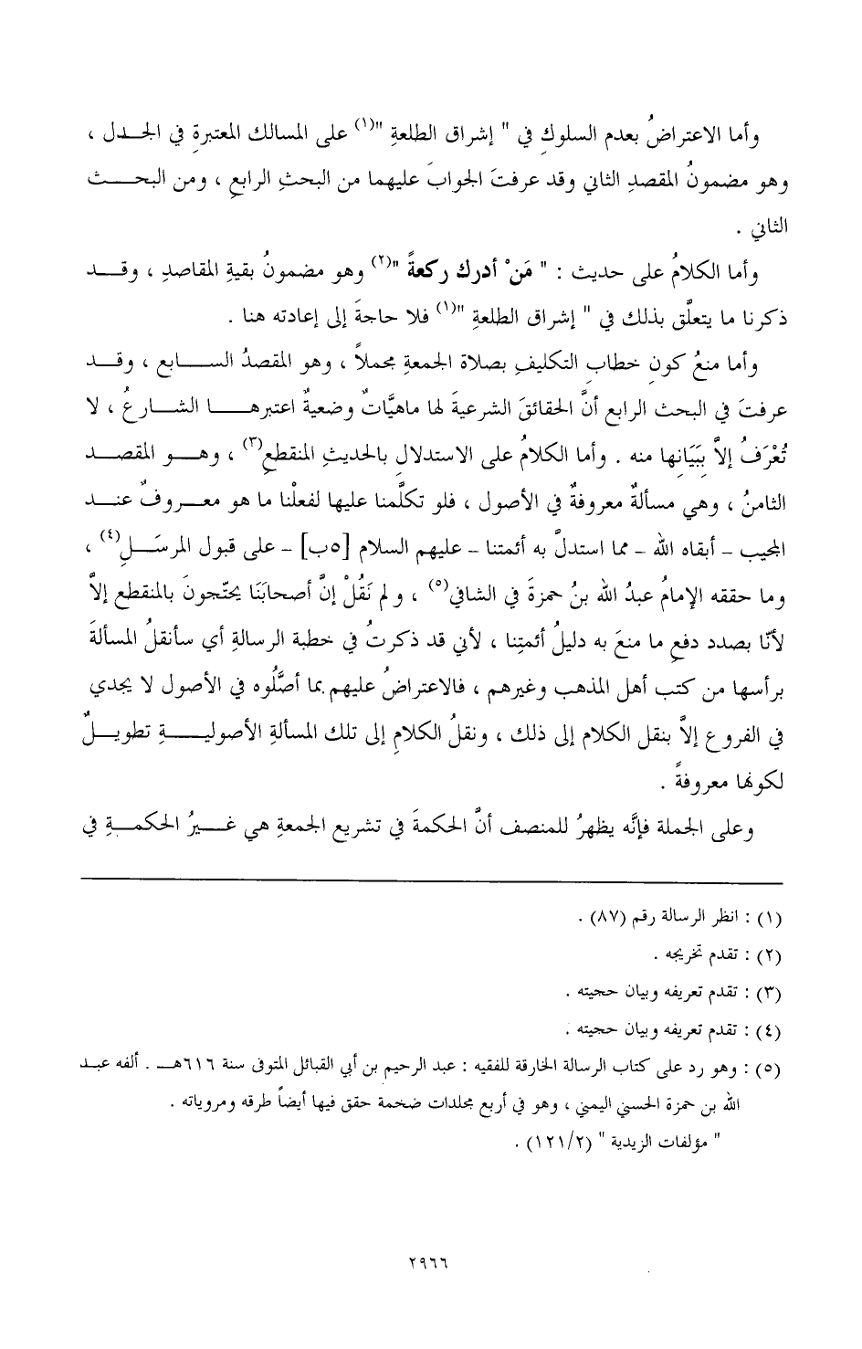 وأما منع كون خطاب التكليف بصلاة الجمعة مجملا وهو المقصد السابع، وقد عرفت في البحث الرابع أن الحقائق الشرعية لها ماهيات وضعية اعتبرها الشارع لا تعرف إلا ببيانها منه. وأما الكلام على الاستدلال بالحديث المنقطع (¬4) وهو المقصد الثامن، وهي مسألة معروفة في الأصول، فلو تكلمنا عليها لفعلنا ما هو معروف عند المجيب أبقاه الله، مما استدل به أئمتنا عليهم السلام [5ب] على قبول المرسل (¬5) وما حققه الإمام عبد الله بن حمزة في الشافي (¬6)، ولم نقل إن أصحابنا يحتجون بالمنقطع إلا لأنا بصدد دفع ما منع به دليل أئمتنا، لأني قد ذكرت في خطبة الرسالة أي سأنقل المسألة برأسها من كتب أهل المذهب وغيرهم، فالاعتراض عليهم بما أصلوه في الأصول لا يجدي في الفروع إلا بنقل الكلام إلى ذلك، ونقل الكلام إلى تلك المسألة الأصولية تطويل لكونها معروفة.
