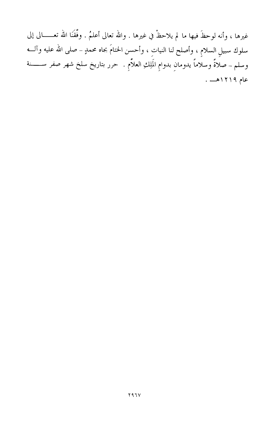غيرها، وأنه لوحظ فيها ما لم يلاحظ في غيرها. والله تعالى أعلم. وفقنا الله تعالى إلى سلوك سبيل السلام وأصلح لنا النيات، وأحسن الختام بجاه محمد صَلَّى اللهُ عَلَيْهِ وَآلِهِ وَسَلَّمَ صلاة وسلاما يدومان بدوام الملك العلام. حرر بتاريخ سلخ شهر صفر سنة 1219 هـ.