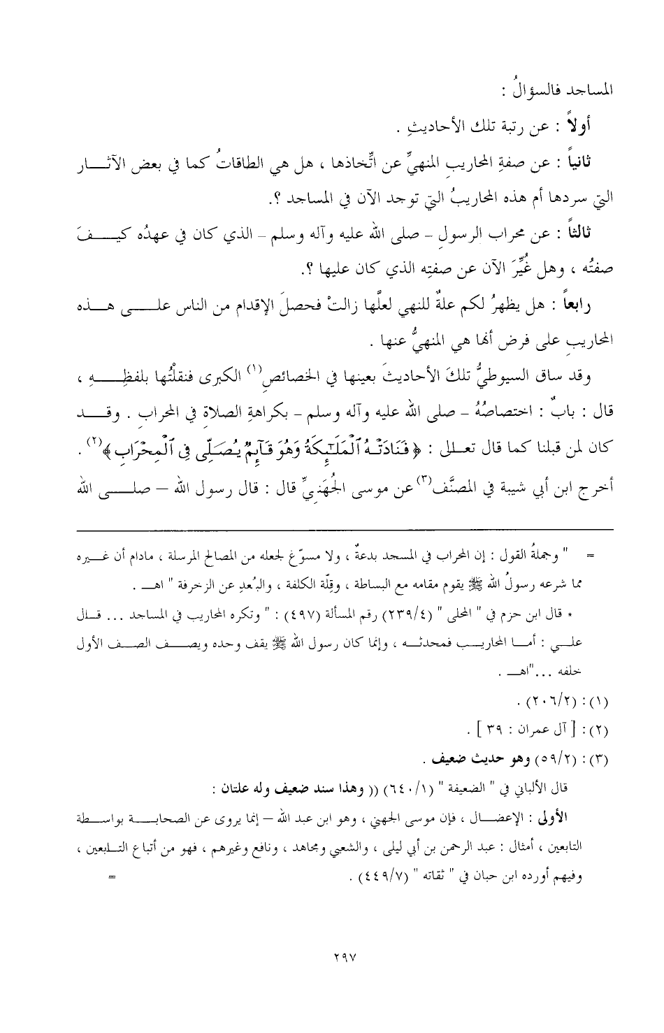 رابعًا: هل يظهر لكم عله للنهي لعلها زالت فحصل الإقدام من الناس على هذه المحاريب على فرض أنها هي المنهي عنها.