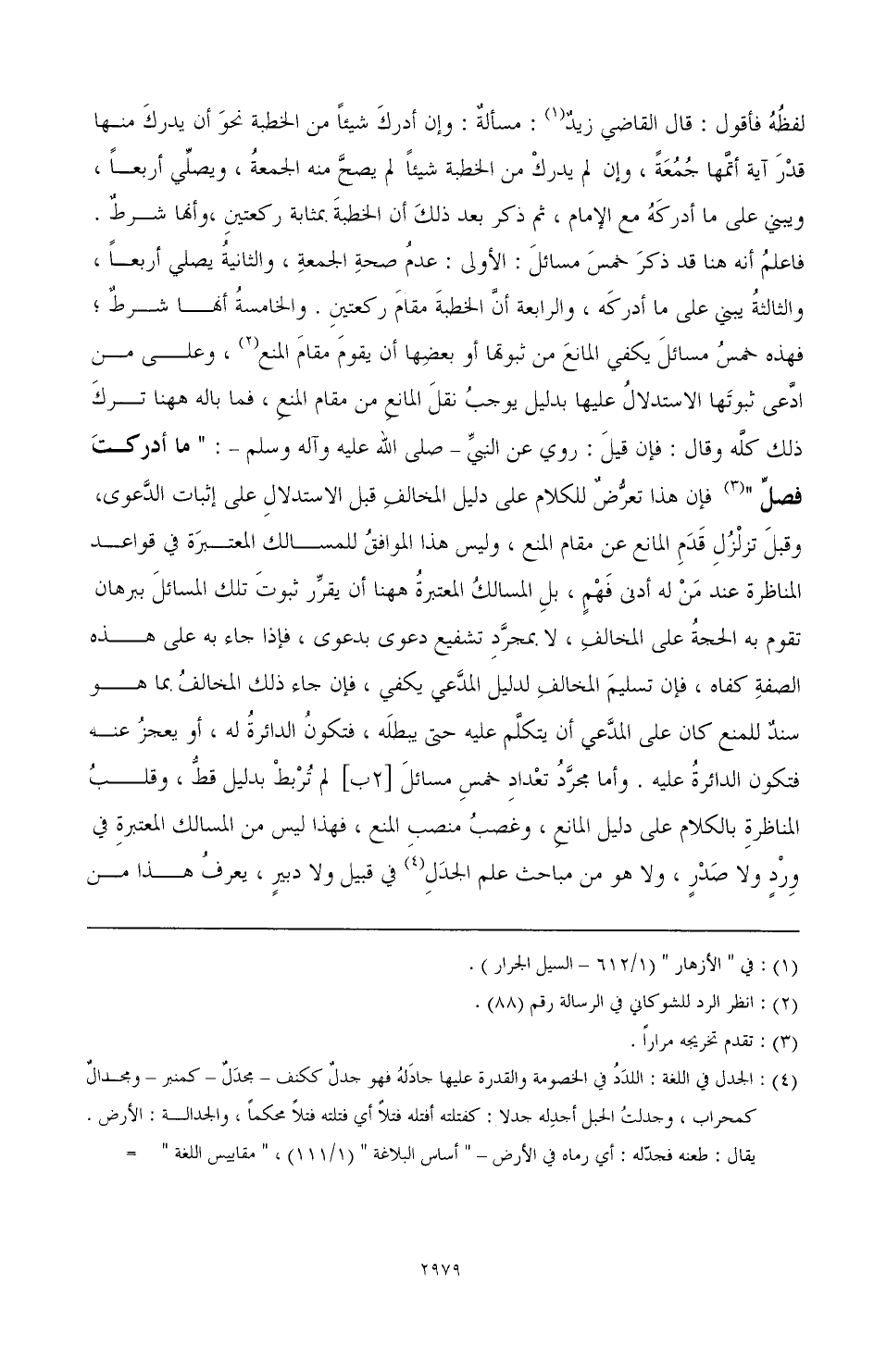 لفظه فإقول: قال القاضي زيد (¬1): مسألة: وإن أدرك شيئا من الخطبة نحو أن يدرك منها قدر آية أتمها جمعة، وإن لم يدرك من الخطبة شيئا لم يصح منه الجمعة، ويصلي أربعا، ويبني على ما أدركه مع الإمام، ثم ذكر بعد ذلك أن الخطبة بمثابة ركعتين، وأنها شرط. فاعلم أنه هنا قد ذكر خمس مسائل: الأولى: عدم صحة الجمعة، والثانية يصلي أربعا، والثالثة يبني على ما أدركه، والرابعة أن الخطبة مقام ركعتين. والخامسة أنها شرط، فهذه خمس مسائل يكفي المانع من ثبوتها أو بعضها أن يقوم مقام المنع (¬2)، وعلى من ادعى ثبوتها الاستدلال عليها بدليل يوجب نقل المانع من مقام المنع، فما باله ههنا ترك ذلك كله وقال: فإن قيل: روي عن النبي - صَلَّى اللهُ عَلَيْهِ وَآلِهِ وَسَلَّمَ -: " ما أدركت فصل " (¬3) فإن هذا تعرض للكلام على ذليل المخالف قبل الاستدلال على إثبات الدعوى، وقيل تزلزل قدم المانع عن مقام المنع، وليس هذا الموافق للمسالك المعتبرة في قواعد المناظرة عند من له أدنى فهم، بل المسالك المعتبرة ههنا أن يقرر ثبوت تلك المسأئل ببرهان تقوم به الحجة على المخالف، لا بمجرد تشفيع دعوى بدعوى، فإذا جاء به على هذه الصفة كفاه، فإن تسليم المخالف لدليل المدعي يكفي، فإن جاء ذلك المخالف بما هو سند للمنع كان على المدعي أن يتكلم عليه حتي يبطله، فتكون الدائرة له، أو يعجز عنه فتكون الدائرة عليه. وأما مجرد تعداد خمس مسائل [2ب] لم تربط بدليل قط، وقلب المناظرة بالكلام على دليل المانع، وغضب منصب المنع، فهذا ليس من المسالك المعتبرة في ورد ولا صدر، ولا هو من مباحث على الجدل (¬4) في قبيل ولا بير، يعرف هذا من
