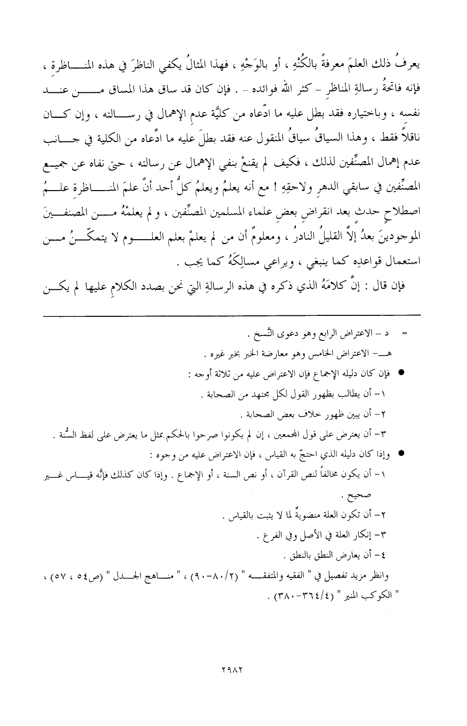 يعرف ذلك العلم معرفة بالكنه، أو بالوجه، فهذا المثال يكفي الناظر في هذه المناظرة، فإنه فاتحة رسالة المناظر - كثر الله فوائده -. فإن كان قد ساق هذا المساق من عند نفسه، وباختيارة فقد بطل عليه ما ادعاه من كلية عدم الإهمال في رسالته، وإن كان ناقلا فقط، وهذا السياق سياق المنقول عنه فقد بطل عليه ما ادعاه من الكلية في جانب عدم إهمال المصنفين لذلك، فكيف لم يقنع بنفي الإهمال عن رسالته، حتى نفاه عن جميع المصنفين في سابقي الدهر ولا حقه! مع أنه يعلم ويعلم كل أحد أن علم المناظرة علم اصطلاح حدث بعد انقراض بعض علماء المسلمين المصنفين، ولم يعلمه من المصنفين الموجودين بعد إلا القليل النادر، ومعلوم أن من لم يعلم بعلم العلوم لا يتمكن من استعمال قواعده كما ينبغي، ويراعي مسالكه كما يجب.