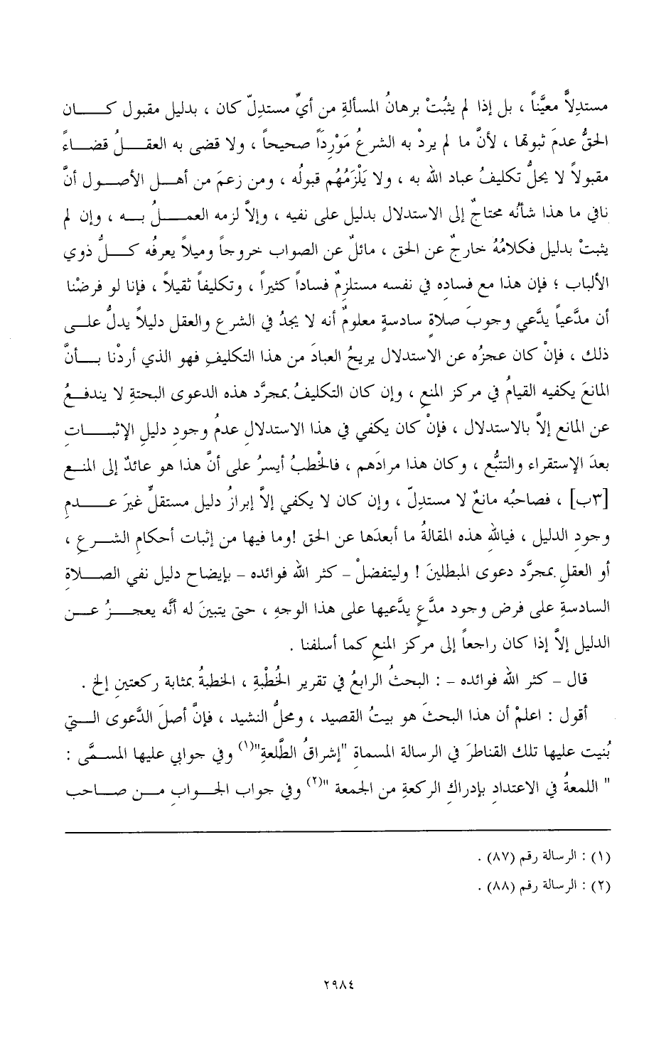 أقول: اعلم أن هذا البحث هو بيت القصيد، ومحل النشيد، فإن أصل الدعوى التي بنيت عليها تلك القناطر في الرسالة لمسماة " إشراق الطلعة " (¬1) وفي جوابي عليها المسمى: " اللمعة في الاعتداد بإدراك الركعة من الجمعة " (¬2) وفي الجواب من صاحب