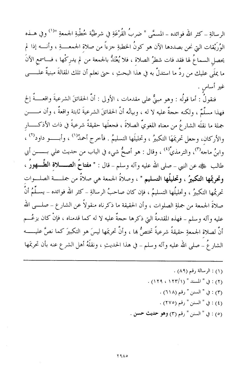 فنقول: أما قوله: وهو مبني على مقدمات، ألأولى: أن الحقائق الشرعية واقعة إلخ فهذا مسلم، ولكنه حجة عليه لا له، وبيانه أن الحقائق الشرعية ثابتة واقعة، وأن من جملة ما نقله الشارع من معناه اللغوي الصلاة، فجعلها حقيقة شرعية في ذات الأذكار والأركان، وجعل تحريمها التكبير، وتحليلها التسليم. فأخرج أحمد (¬2)، وأبو داود (¬3)، وابن ماجه (¬4)، والترمذي (¬5)، وقال: هو أصح شيء في الباب من حديث علي ابن أبي طالب - رضي الله عنه - عن النبي - صَلَّى اللهُ عَلَيْهِ وَآلِهِ وَسَلَّمَ - قال: " مفتاح الصلاة الطهور، وتحريمها التكبير، وتحليلها التسليم "، فإن وصلاة الجمعة هي صلاة من جملة الصلوات تحريمها التكبير، وتحليلها التسليم، فإن كان صاحب الرسالة - كثر الله فوائده - يسلم أن صلاة الجمعة من جملة الصلوات، وأن الحقيقة ما ذكرناه منقولا عن الشارع - صَلَّى اللهُ عَلَيْهِ وَآلِهِ وَسَلَّمَ - فهذه المقدمة التي ذكرها حجة عليه لا له كما قدمناه، فإن كان يزعم أن الصلاة الجمعة حقيقة شرعية تختص بها، وأن تحريمها ليس هو التكبير كما نص عليه الشارع - صَلَّى اللهُ عَلَيْهِ وَآلِهِ وَسَلَّمَ - في هذا الحديث، ونقله أهل الشرع عنه بأن تحريمها
