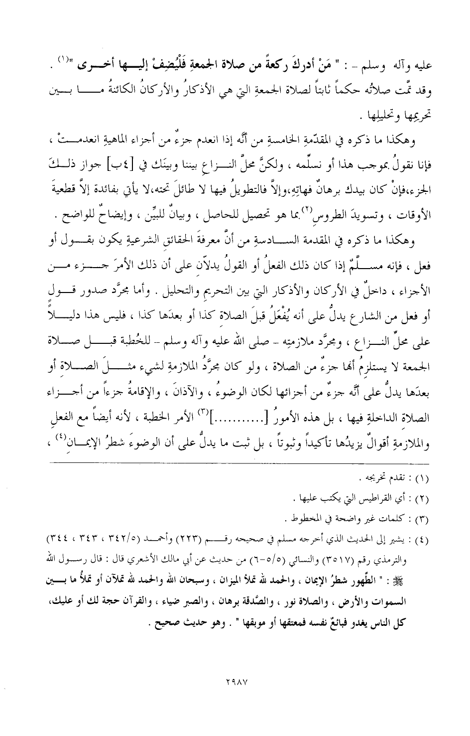 (¬4) يشير إلى الحديث الذي أخرجه مسلم في صحيحه رقم (223) وأحمد (5، 343، 344) والترمذي رقم (3517) والنسائي (5/ 5 - 6) من حديث عن أبي مالك الأشعري قال: قال رسول الله - صَلَّى اللهُ عَلَيْهِ وَسَلَّمَ -: " الطهور شطر الايمان، والحمد لله تملأ الميزان، وسبحان الله والحمد لله تملآن أو تملأ ما بين السموات والأرض، والصلاة نور، والصدقة برهان، والصبر ضياء، والقرآن حجة لك أو عليك، كل الناس يغدو فبائع نفسه فمعتقها أو موبقها ". وهو حديث صحيح.