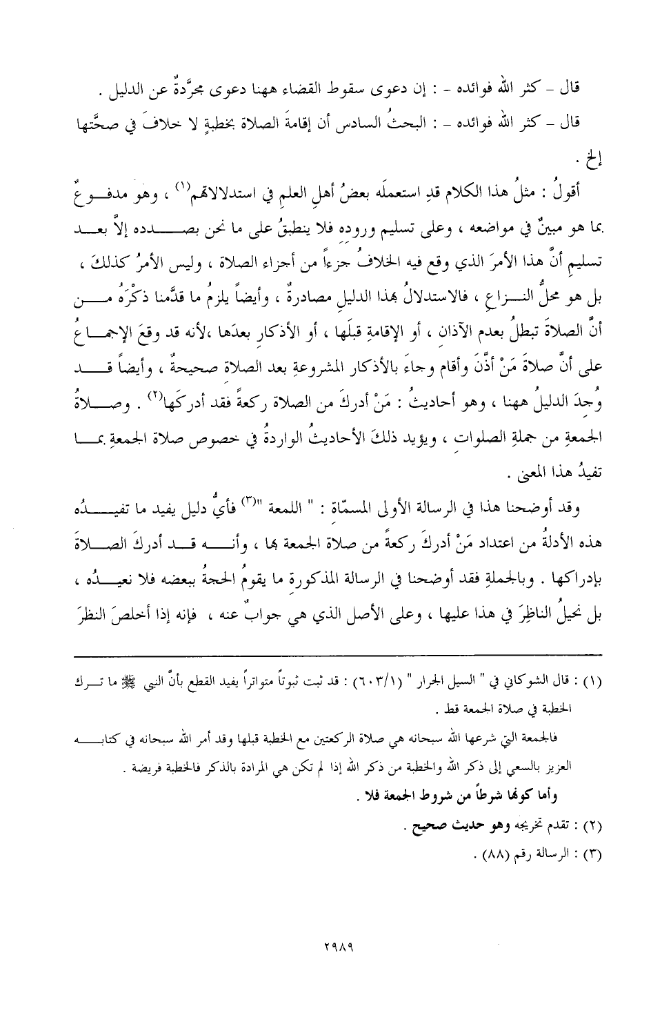 وقد أوضحنا هذا في الرسالة الأولى المسماة: " اللمعة " (¬3) فأي دليل يفيد ما تفيده هذه الأدلة من اعتداد من أدرك ركعة من صلاة الجمعة بها، وأنه قد أدرك الصلاة بإدراكها. وبالجملة فقد أوضحنا في الرسالة المذكورة ما يقو م الحجة ببعضه فلا نعيده، بل نحيل الناظر في هذا عليها، وعلى الأصل الذي هي جواب عنه، فإنه إذا أخلص النظر