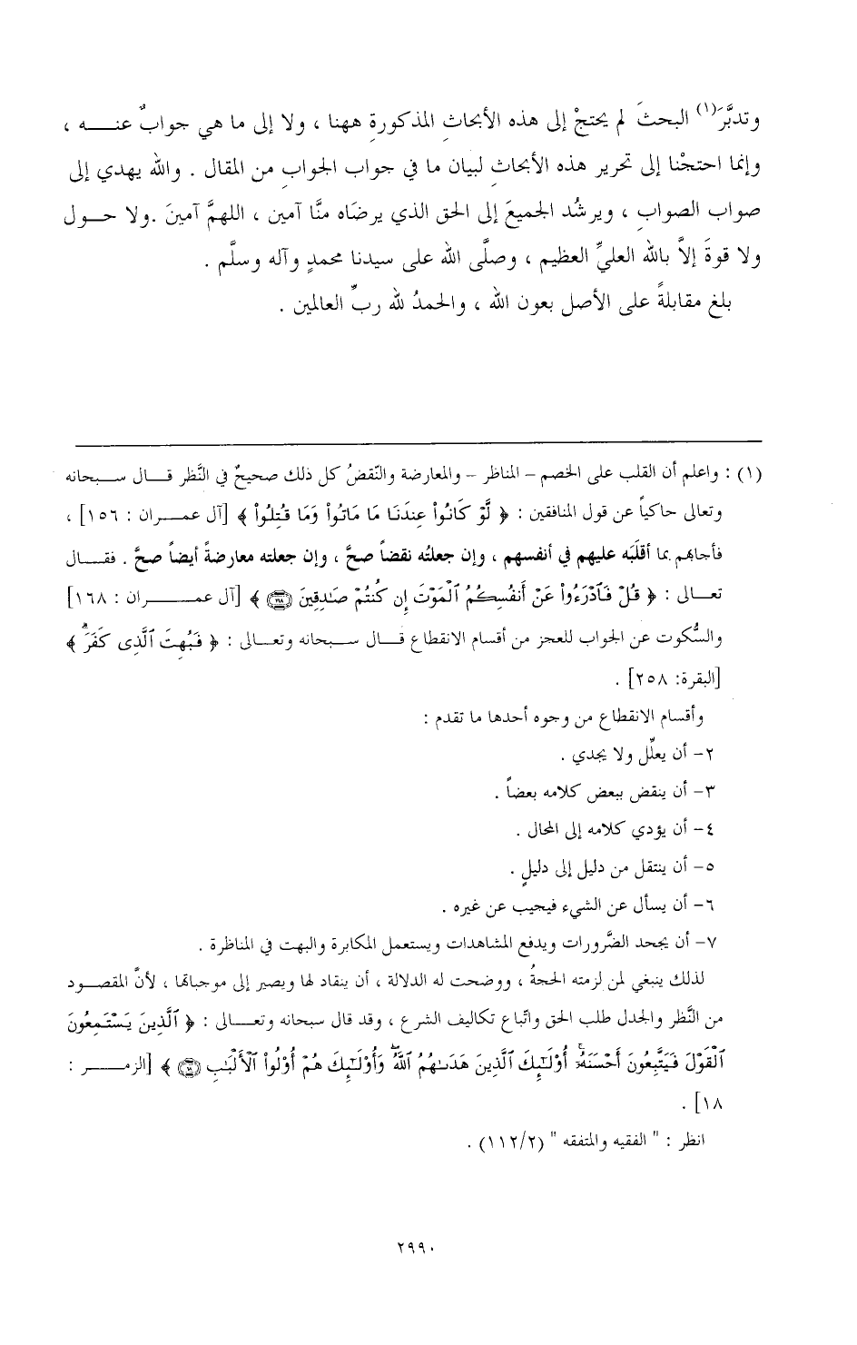 (¬1) واعلم أن القلب على الخصم - المناظر - والمعارضة والنقض كل ذلك صحيح في النظر قال سبحانه وتعالى حاكيا عن قول المنافقين: (لَوْ كَانُوا عِنْدَنَا مَا مَاتُوا وَمَا قُتِلُوا) [آل عمران: 168]، فأجابهم بما أقلبه عليهم في أنفسهم، وإن جعلته نقضا صح، وإن جعلته معارضة أيضًا صح. فقال تعالى: (فَادْرَءُوا عَنْ أَنْفُسِكُمُ الْمَوْتَ إِنْ كُنْتُمْ صَادِقِينَ) [آل عمران: 168] والسكوت عن الجواب للعجز من أقسام الانقطاع قال سبحانه وتعالى: (فَبُهِتَ الَّذِي كَفَرَ) [البقرة: 258].