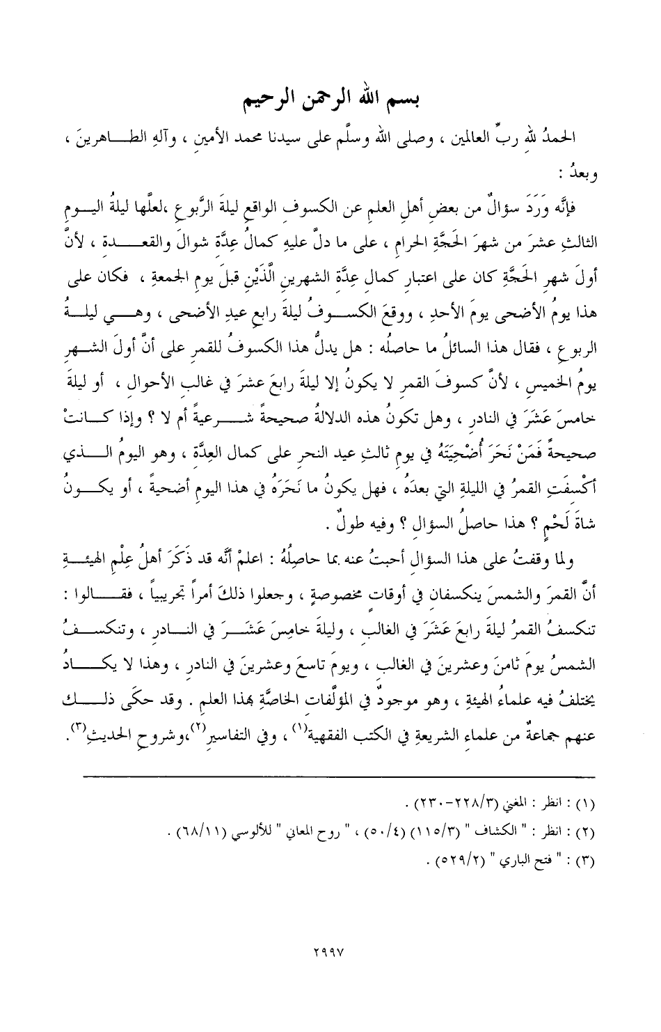 فإنه ورد سؤال من بعض أهل العلم عن الكسوف الواقع ليلة الربوع، لعلها اليوم الثالث عشر من شهر الحجة الحرام، على ما دل عليه كما عدة شوال والقعدة، لأن أول شهر الحجة كان على اعتبار كمال عدة الشهرين الذين قبل يوم الجمعة، فكان على هذا يوم الأضحى يوم الأحد، ووقع الكسوف ليلة رابع عيد الأضحى، وهي ليلة الربوع، فقال هذا السائل ما حاصله: هل يدل هذا الكسوف للقمر على أن أول الشهر يوم الخميس، لأن كسوف القمر لا يكون إلا ليلة رابع عشر في غالب الأحوال، أو ليلة خامس عشر في النادر، وهل تكون هذه الدلالة صحيحة شرعية أم لا؟ وإذا كانت صحيحة فمن نحر أضحيته في يوم ثالث عيد النحر على كمال العدة، وهو اليوم الذي كسفت القمر في الليلة التي بعده، فهل يكون ما نحره في هذا اليوم أضحية، أو يكون شاة لحم؟ هذا حاصل السؤال؟ وفيه طول.