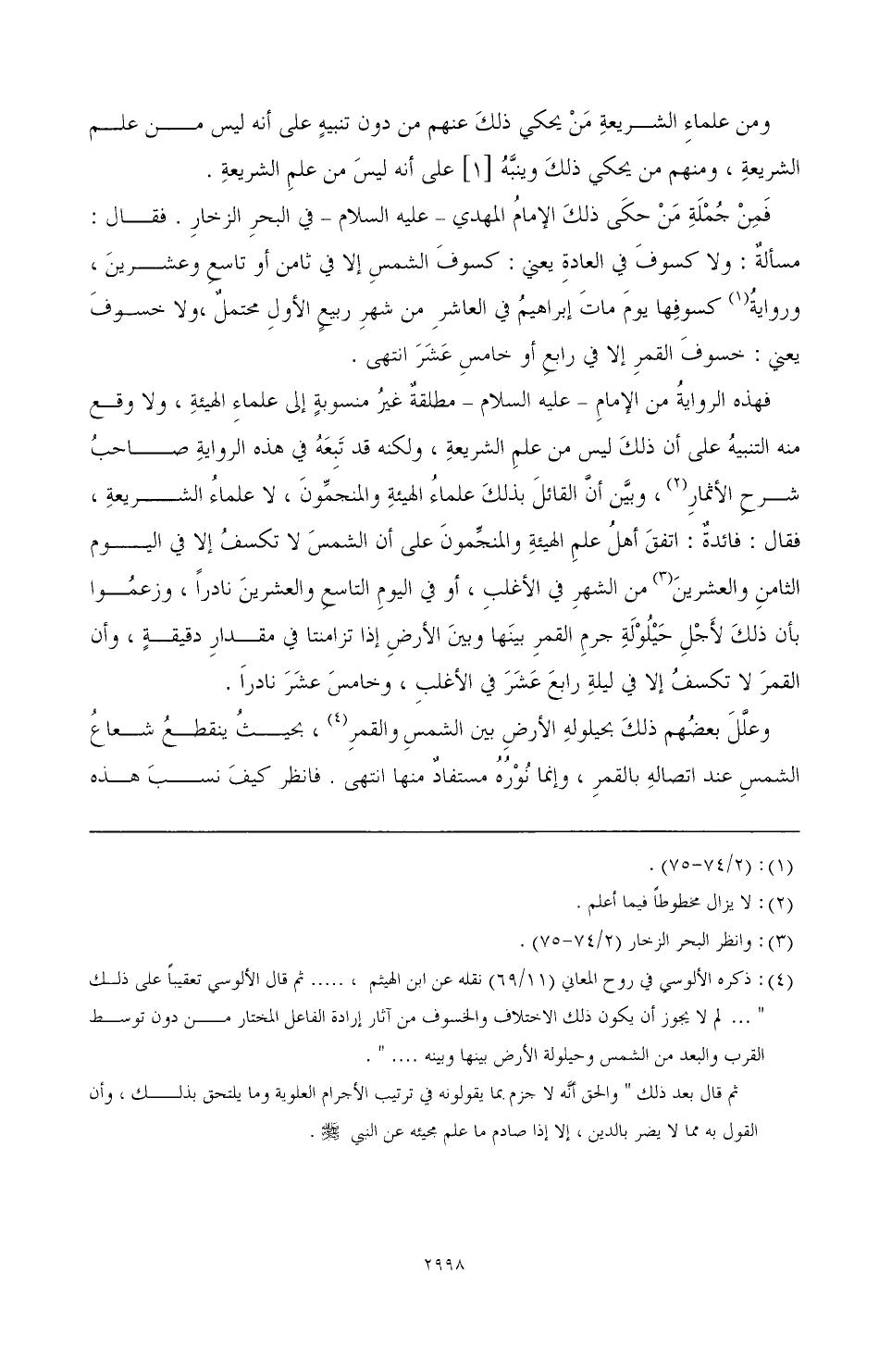 (¬4) ذكره الألوسي في روح المعاني (11/ 69) نقله عن ابن الهيثم،. ..... ثم قال الألوسي تعقيبا على ذلك ". . لم لا يجوز أن يكون ذلك الاختلاف والخسوف من آثار إرادة الفاعل المختار من دون توسط القرب والبعد من الشمس وحيلولة الأرض بينها وبينه. .. ".